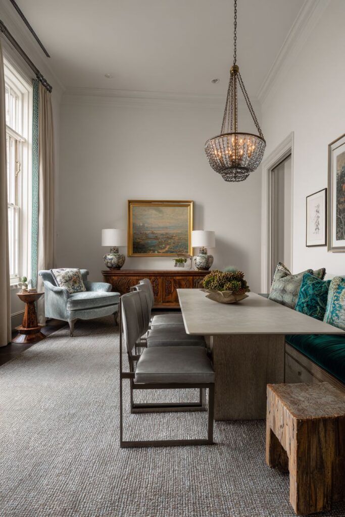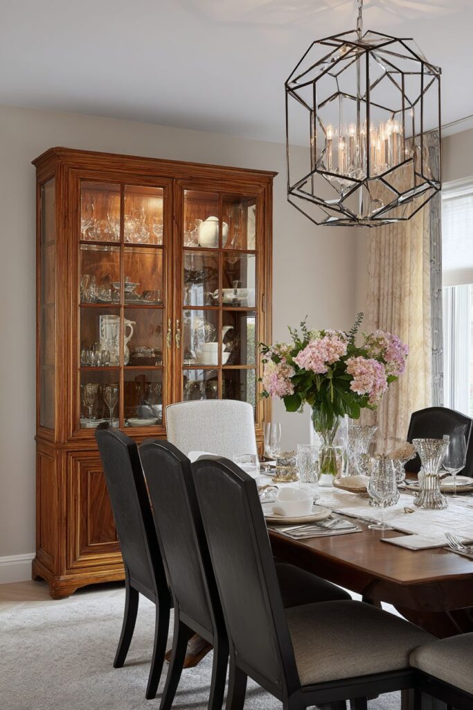 Family heirlooms mixed with contemporary purchases create a dining space that tells the story of multiple generations while remaining functional for modern living. Grandmother’s china cabinet displays vintage dishes alongside modern ceramics, creating a collection that spans decades and reflects evolving taste while honoring family history. This approach to decorating demonstrates how inherited pieces can be integrated into contemporary design without creating museum-like spaces that feel untouchable.