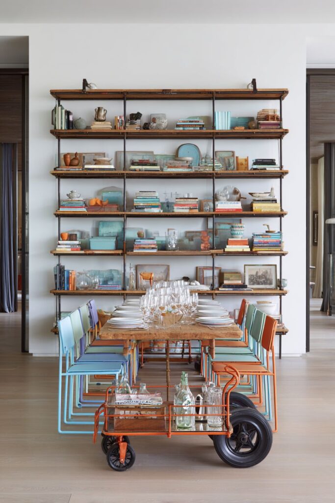 Industrial pipe shelving provides both storage and display opportunities, its utilitarian aesthetic adding another layer to the room’s design narrative. The raw metal finish and exposed hardware reference urban loft living and contemporary industrial design, while the functionality serves practical dining room needs. The shelving displays create opportunities for mixing vintage glassware with contemporary ceramics, reinforcing the room’s commitment to blending old and new elements throughout every aspect of the design.