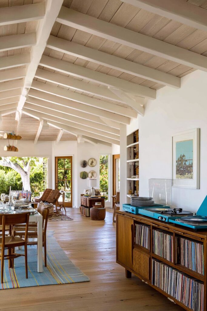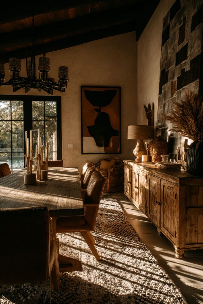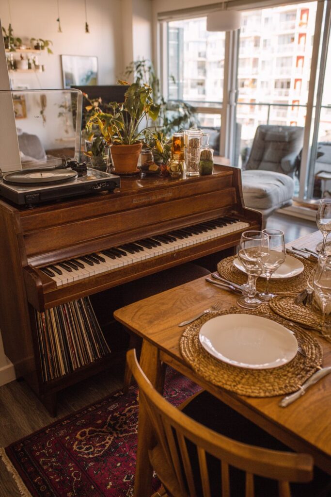 A vintage record player console serves double duty as both an entertainment center and dining storage, demonstrating how eclectic spaces can incorporate personal interests and hobbies into functional furniture pieces. The console’s vinyl collection display, alongside dinner plates and glassware shows how music and dining can coexist beautifully, creating opportunities for soundtrack-enhanced meals and post-dinner entertainment. This integration of personal passions into dining room design creates authentic character that cannot be purchased from furniture stores.