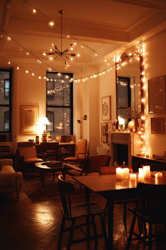 Multiple lighting sources work together to create a sophisticated illumination scheme that adapts to different dining occasions and times of day. A statement modern chandelier provides primary task lighting while serving as a sculptural focal point; vintage table lamps on a sideboard add warm ambient lighting and decorative interest; string lights along windows contribute sparkle and romance; while candles on the dining table create an intimate atmosphere for special occasions. This layered approach ensures appropriate lighting for every dining situation while adding visual interest through varied fixture styles.