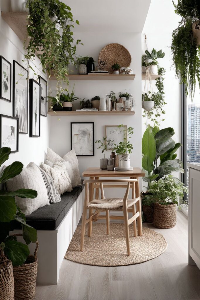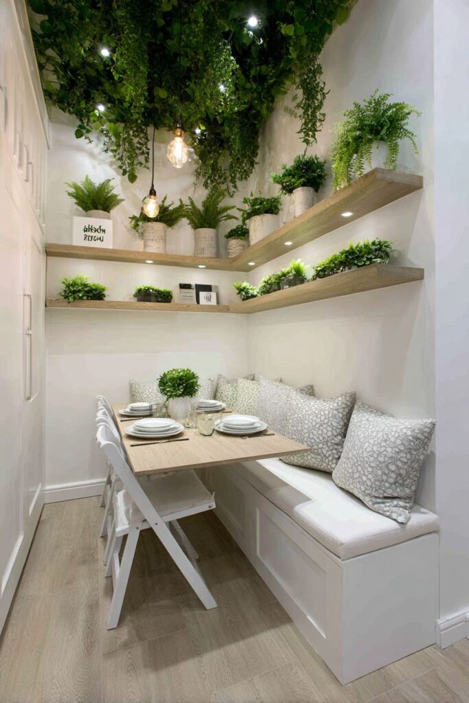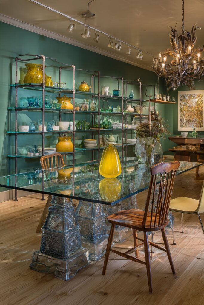 - Use floating shelves to display collections without overwhelming the dining surface