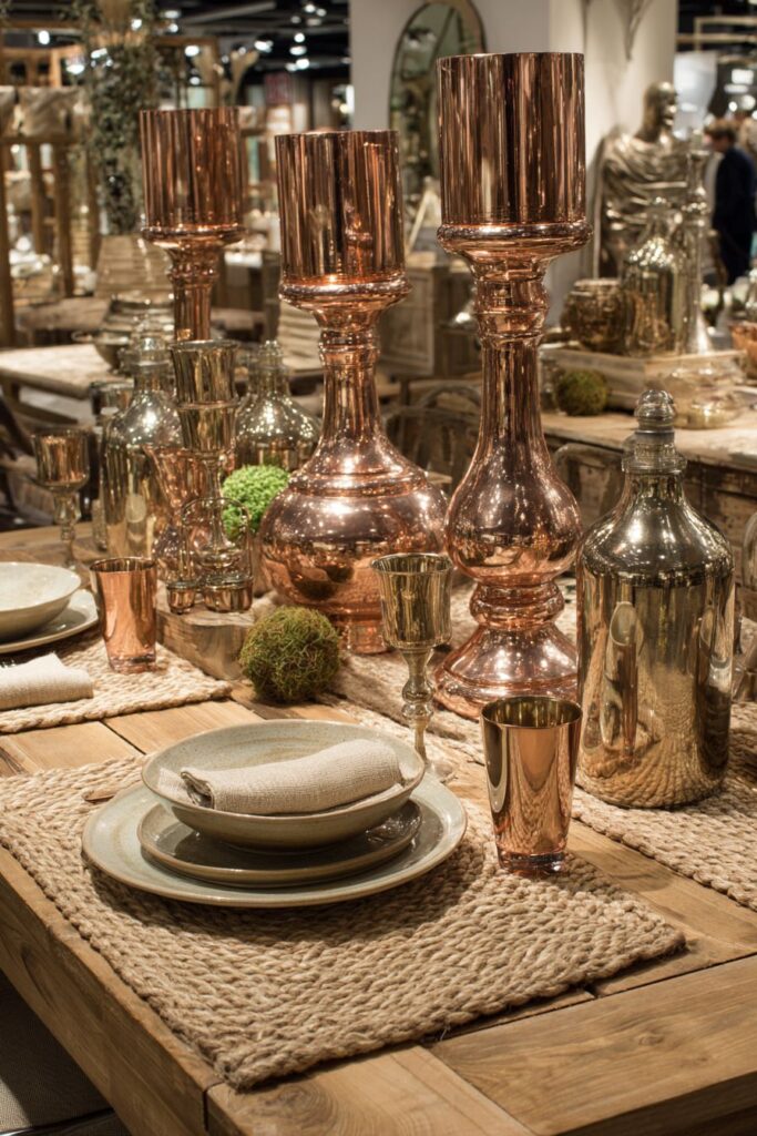 The metallic elements find balance through natural materials that ground the reflective surfaces and prevent the space from feeling cold or overly formal. Jute placemats provide textural contrast and natural warmth; ceramic dishes add handcrafted authenticity and color; while linen napkins contribute softness and tactile comfort. This balance between hard reflective surfaces and soft natural materials creates a dining experience that engages multiple senses.
