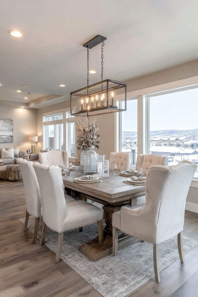 Interchangeable elements throughout the dining space allow for seasonal updates and style evolution without major furniture replacement, demonstrating how thoughtful planning can create long-term design flexibility. Removable chair cushions in different fabrics can be swapped seasonally – light linens for summer, rich velvets for winter – maintaining comfort while refreshing the color palette and textural interest. This approach to seasonal decorating provides variety while maximizing investment in quality foundation pieces.