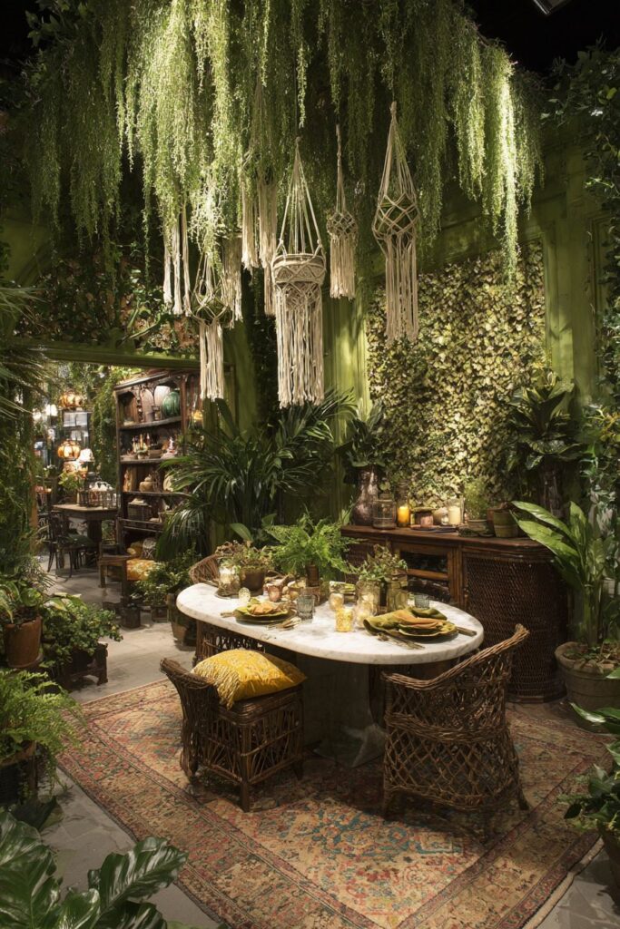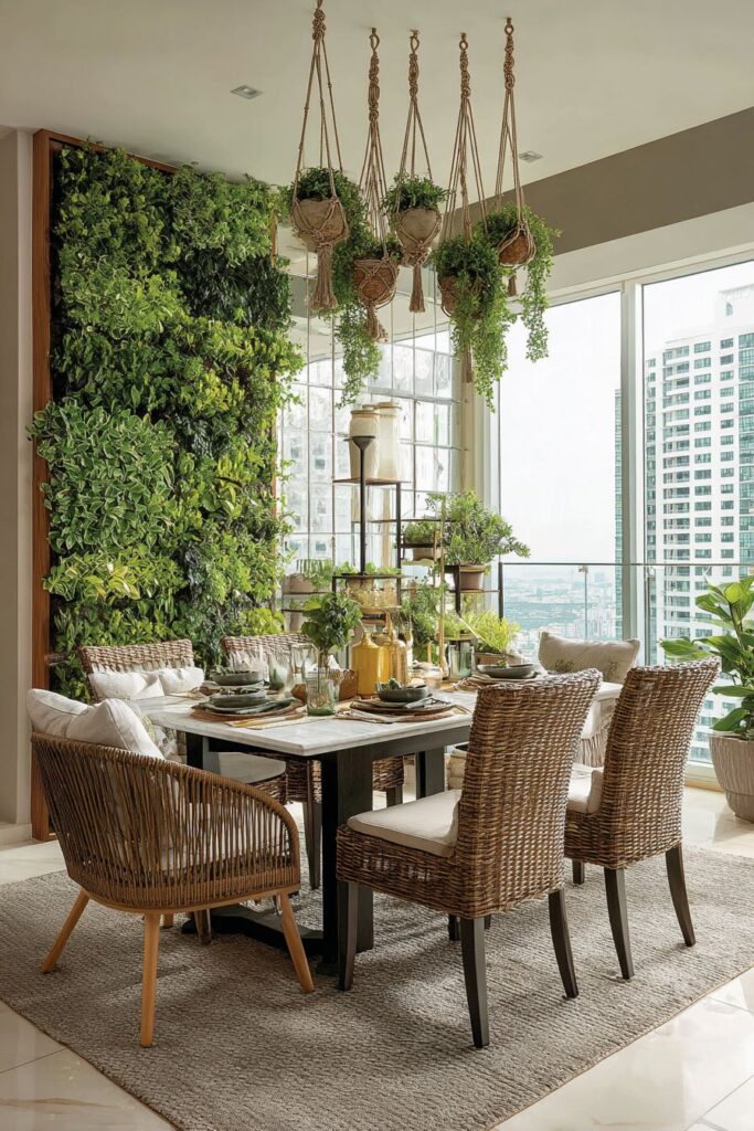 Indoor plants function as living design elements, bringing natural color, texture, and air-purifying benefits to the dining space while supporting the eclectic mixing philosophy through varied container styles and plant forms. Hanging macrame planters at different heights creates vertical interest and bohemian charm; potted plants on plant stands of varying materials – wood, metal, ceramic – add tabletop decoration and textural variety; while a living wall behind the dining area creates a dramatic green backdrop that changes seasonally with plant growth and flowering cycles.