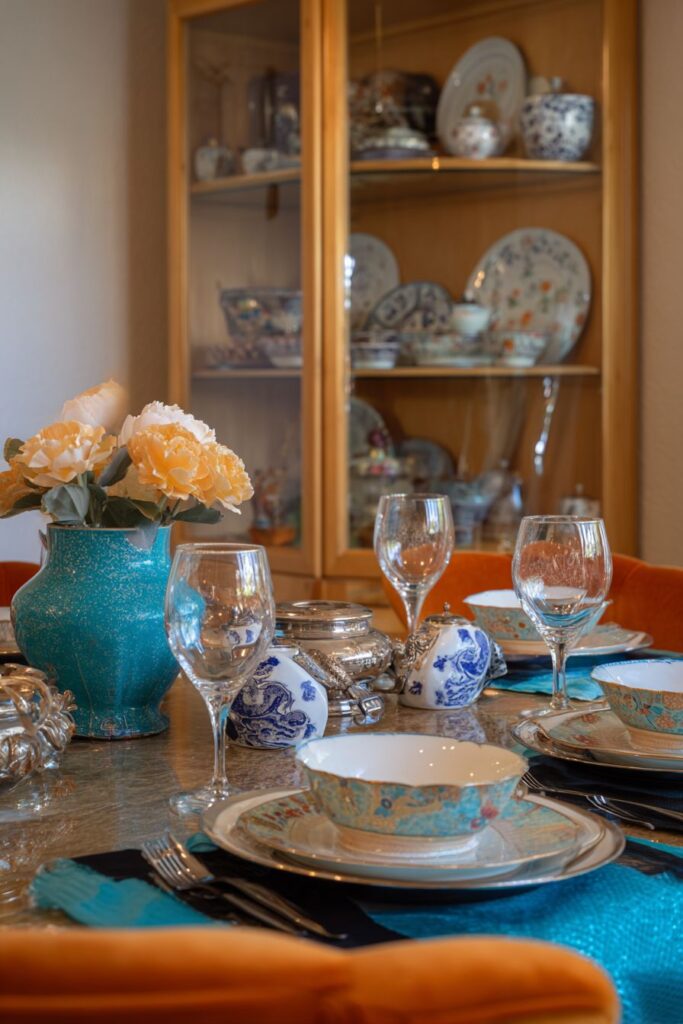 Inherited silver serving pieces paired with new table linens create table settings that blend family tradition with contemporary entertaining styles. This mixing of old and new elements for special occasions shows how eclectic design principles can extend to functional items, creating memorable dining experiences that connect past and present family celebrations.