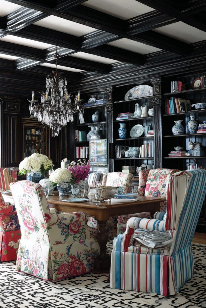 Color psychology applications throughout these designs demonstrate understanding of how hue, saturation, and contrast affect mood and appetite in dining environments. The jewel-toned palettes, neutral anchoring strategies, seasonal color flexibility, and metallic accent coordination show how color can enhance the dining experience while supporting the eclectic mixing philosophy. This sophisticated approach to color creates environments that encourage relaxation, conversation, and enjoyment of food and company.