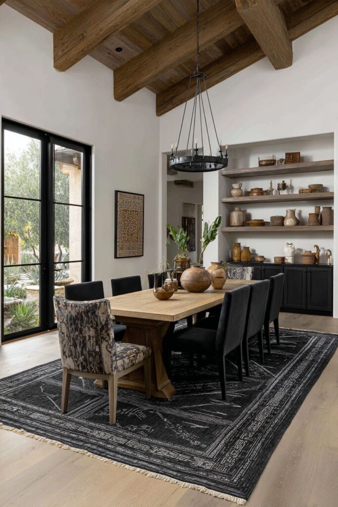 The art of pattern mixing reaches its zenith in this dynamic dining space, where a geometric black and white area rug creates a bold foundation beneath a traditional wooden dining table. The high-contrast pattern provides a strong graphic element that can handle the visual weight of multiple competing designs throughout the room. This sophisticated approach to pattern mixing requires confidence and careful consideration of scale, color, and visual weight to achieve harmony rather than chaos.