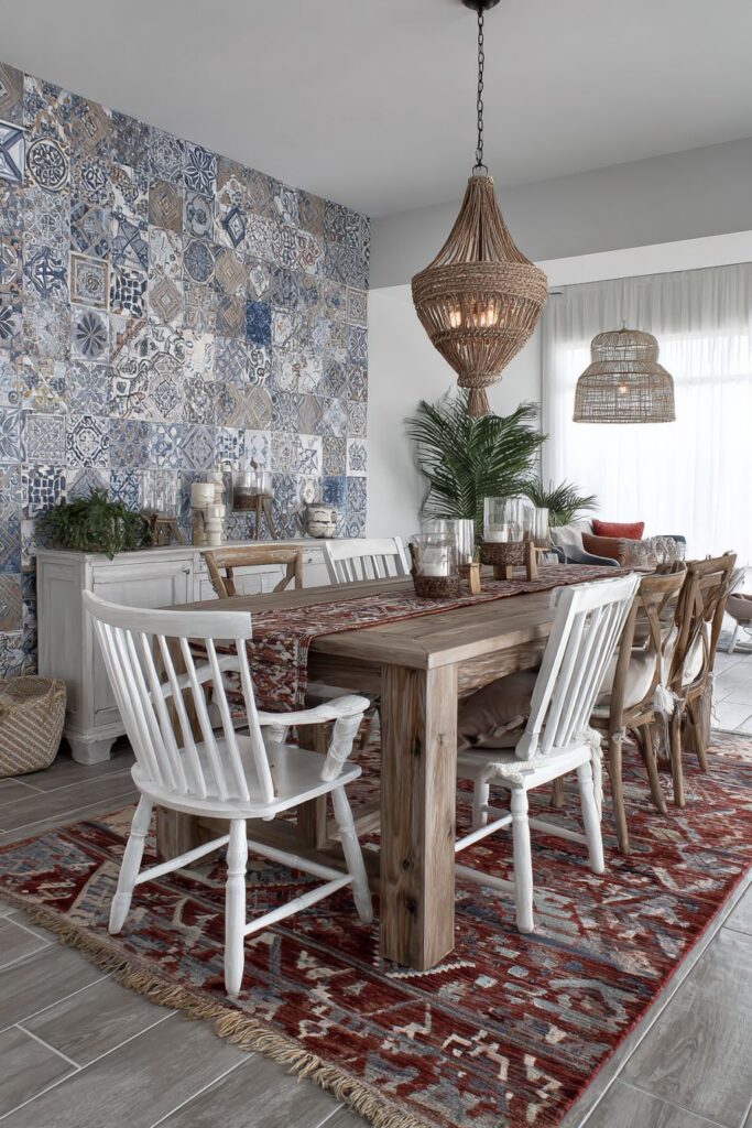 A stunning Moroccan tile accent wall creates an exotic focal point that transports diners to distant lands while maintaining the functionality required for modern living. The intricate geometric patterns and rich colors of authentic Moroccan tilework provide visual complexity and cultural authenticity that cannot be replicated with wallpaper or paint. This bold architectural element serves as the room’s primary design driver, influencing all other material and color choices throughout the space.