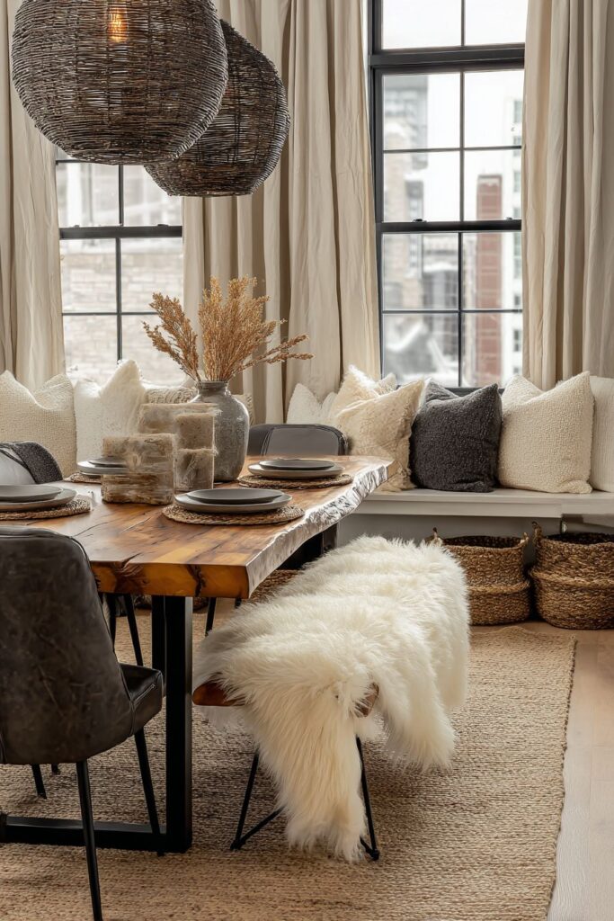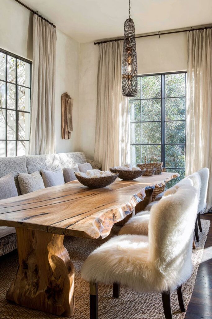 A magnificent live-edge wood dining table serves as the centerpiece for a celebration of natural textures and organic materials. The untreated wood edge preserves the tree’s original form, bringing the raw beauty of nature indoors while providing a substantial and unique focal point that cannot be replicated through manufactured furniture. The natural grain patterns, color variations, and imperfections tell the story of the tree’s growth, making each table truly one-of-a-kind.