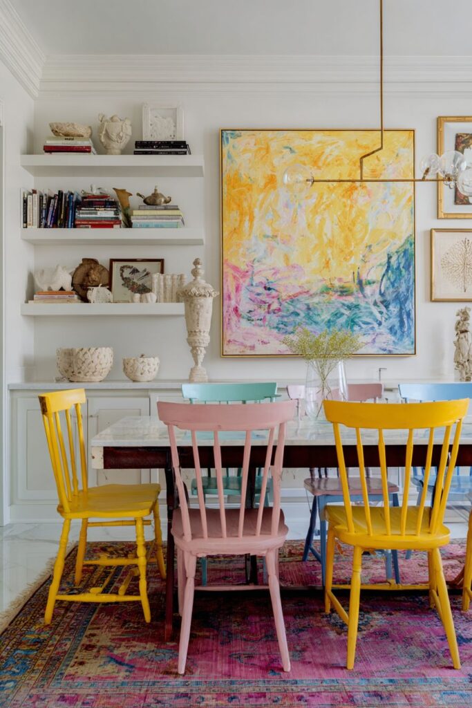 Vintage bentwood chairs painted in different pastel colors create a whimsical seating arrangement that balances the serious art with playful elements. This creative approach to matching dining chairs shows how paint can transform humble vintage finds into unique design elements. Each chair maintains its original bentwood form and comfort while contributing a different color to the room’s palette, creating visual interest and encouraging guests to choose their preferred hue.