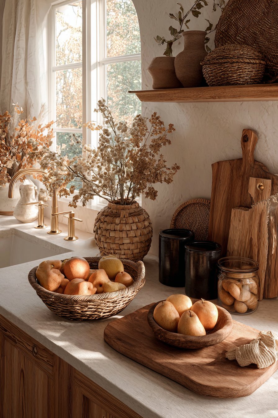 Professional stylists deliberately mix materials within cohesive color palettes—wood cutting boards against ceramic canisters, glass storage beside metal appliances, woven baskets near stone counters. This material dialogue creates visual richness that engages viewers beyond simple color and form. The interplay between smooth and textured, matte and glossy, natural and manufactured elevates simple arrangements into curated displays.