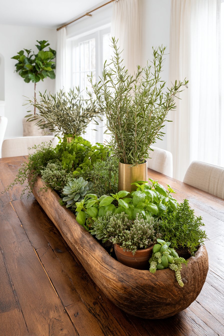 Fresh or preserved greenery brings organic vitality to kitchen tables without obstructing sightlines across the surface. Unlike tall floral arrangements that block conversation and view, low-profile plants create visual interest at eye level when seated. This approach maintains the table’s functionality while adding a natural element that refreshes the space.