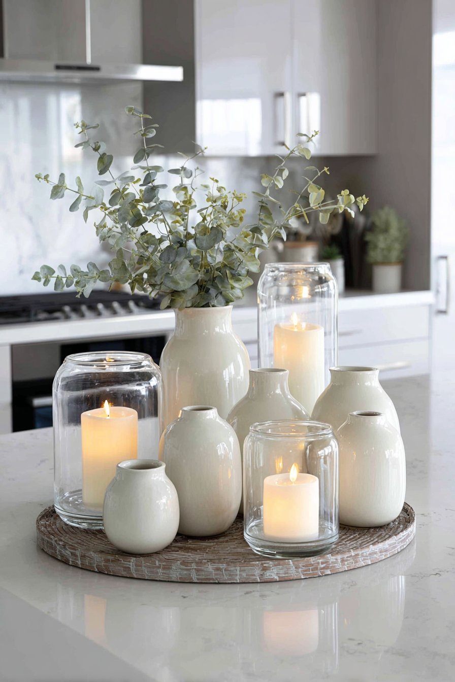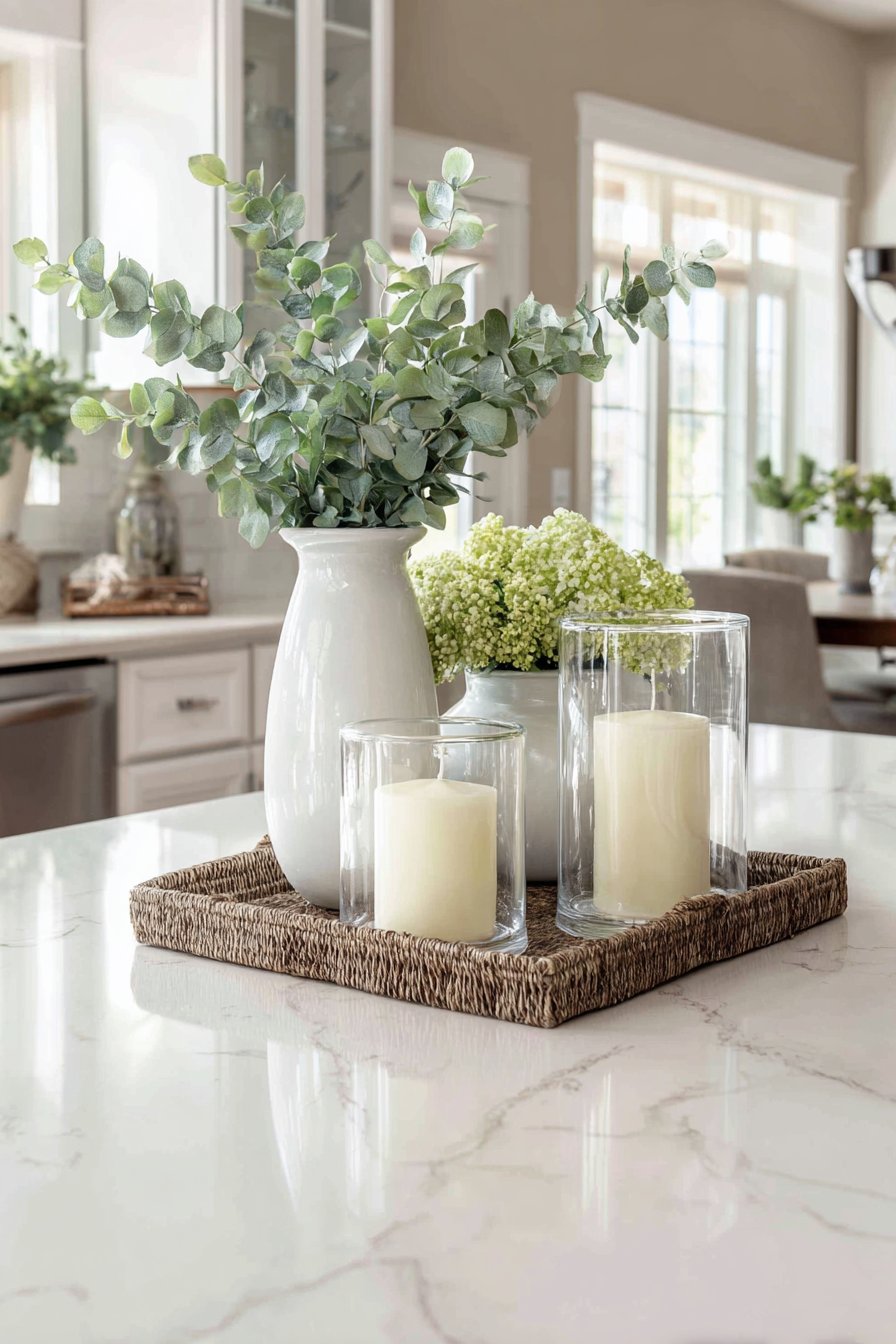 Preserved greenery such as eucalyptus, olive branches, or dried grasses eliminates maintenance entirely while providing lasting beauty. These materials maintain their appearance for weeks or months, making them ideal for homeowners who want consistent styling without daily upkeep. Layer different textures and shades of green to create depth without adding height.
