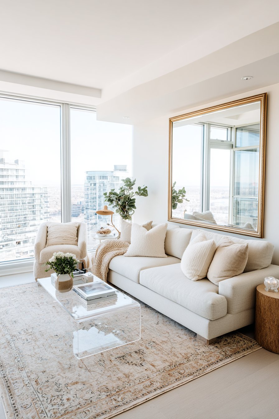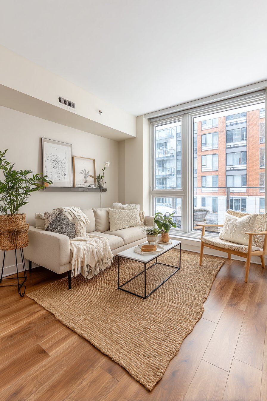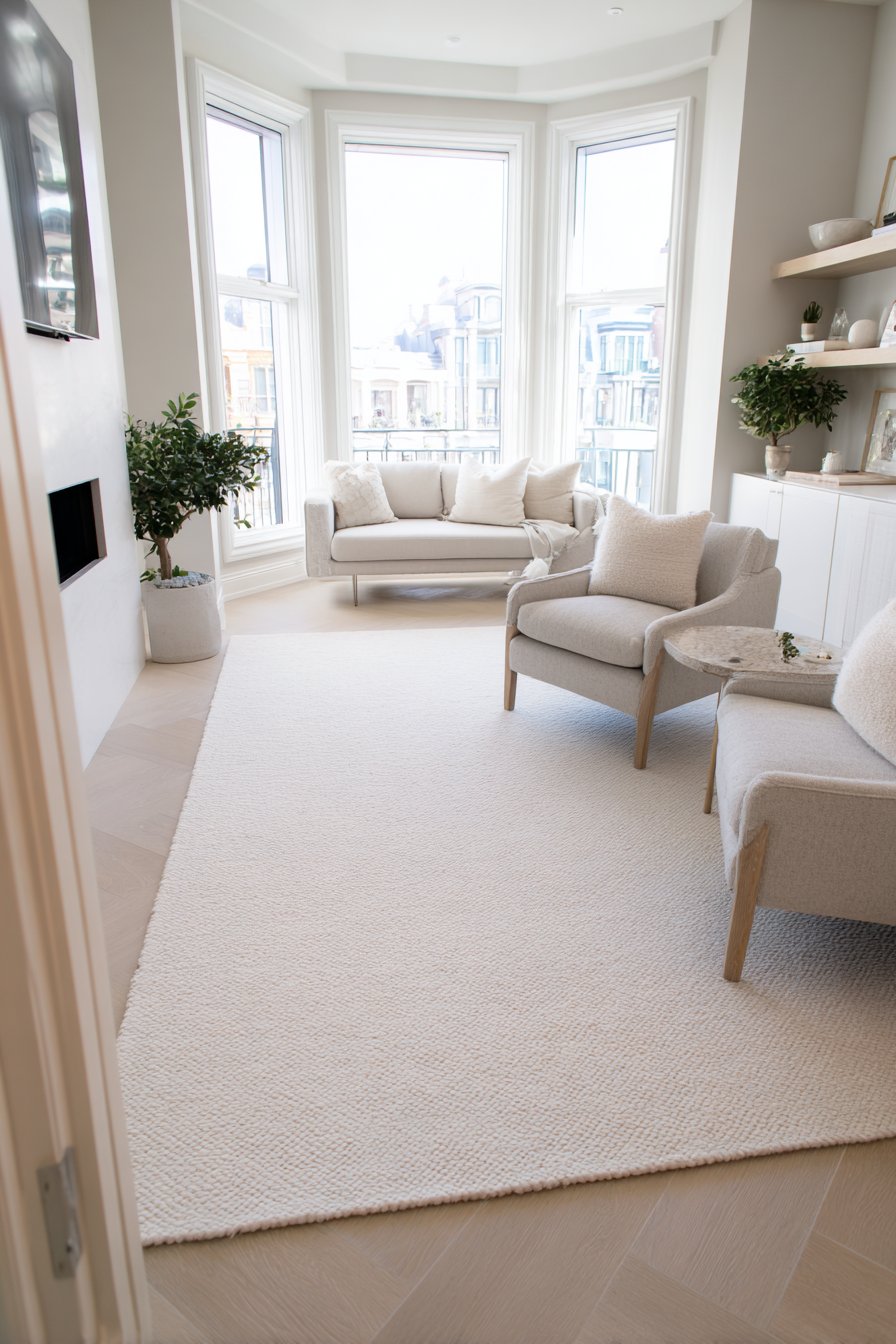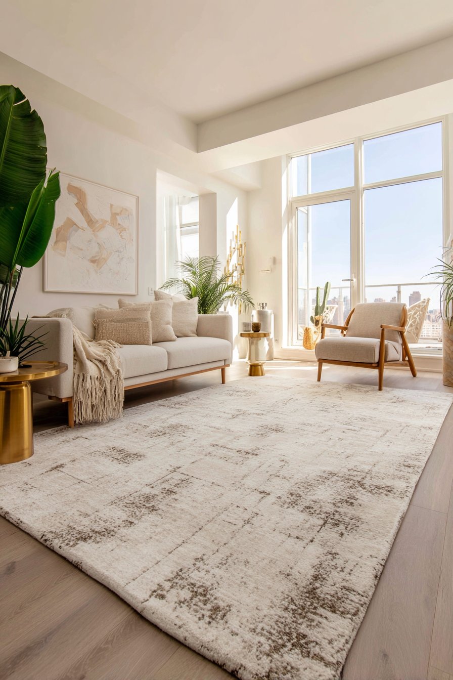 In small spaces, many designers recommend going larger than you think necessary. A bigger rug that ties all the furniture together actually makes the room feel more spacious. It creates a defined “room within a room” effect that adds structure and elegance to an otherwise compact layout.