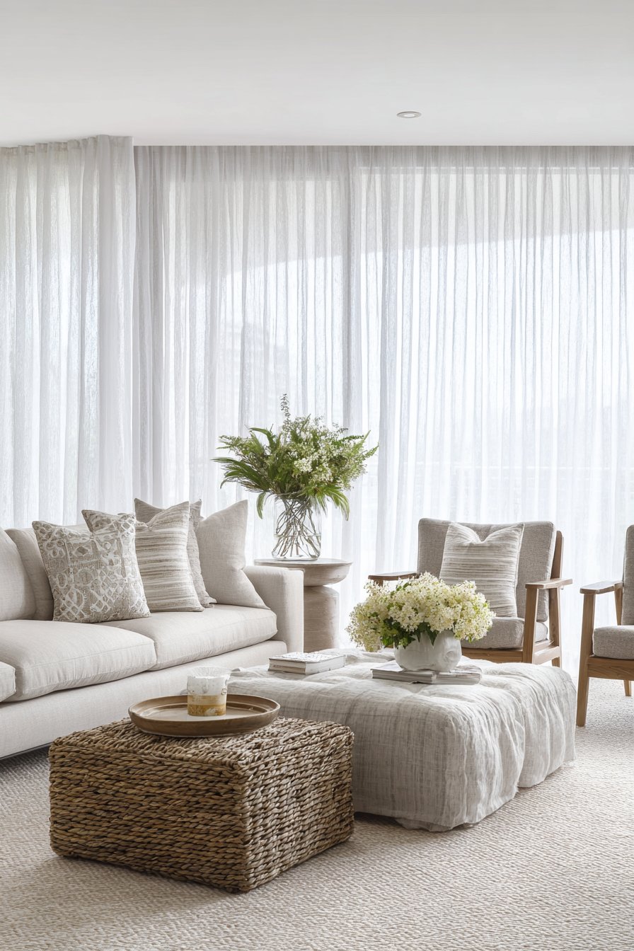 - Swap heavy drapes for sheer linen curtains or light-filtering blinds