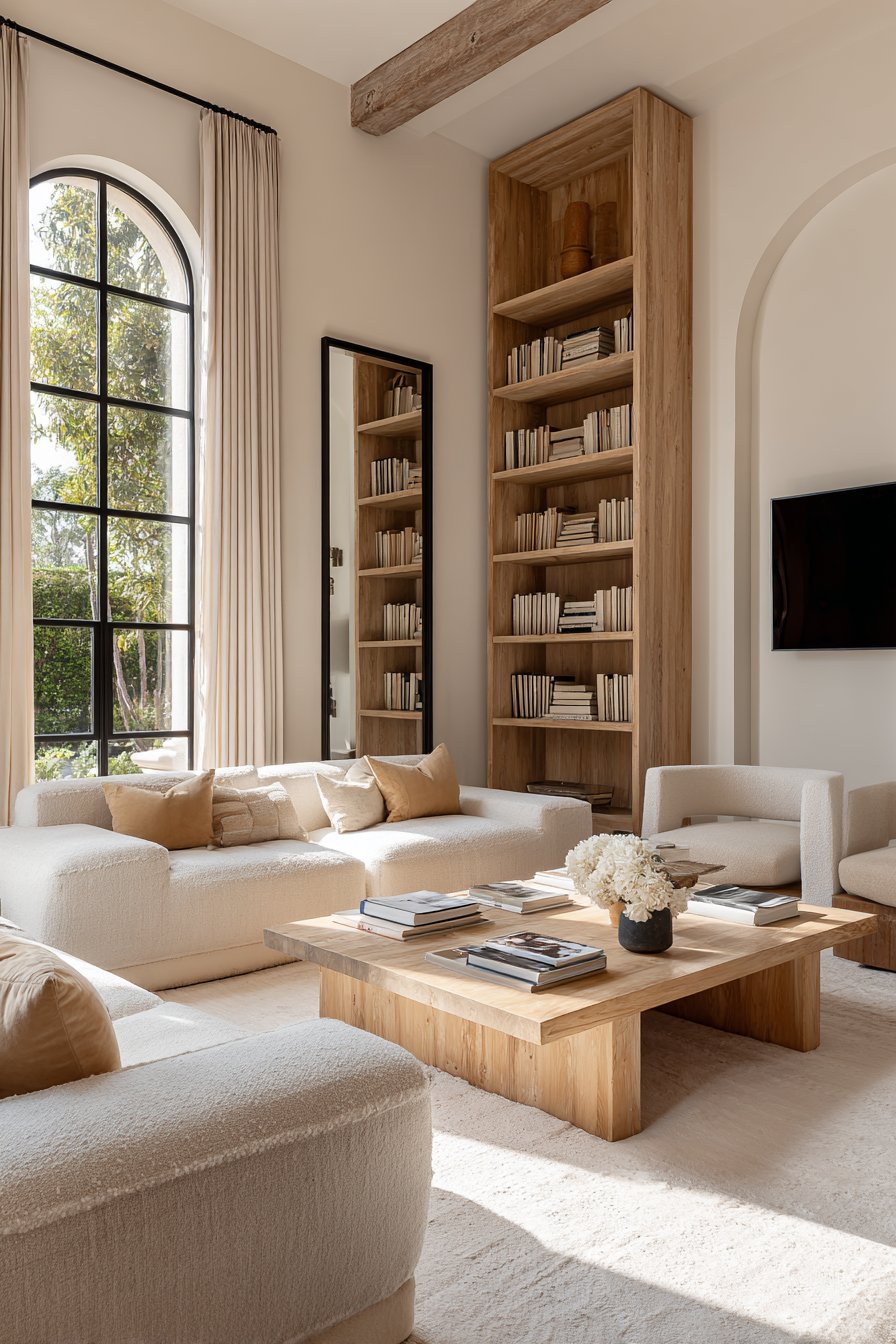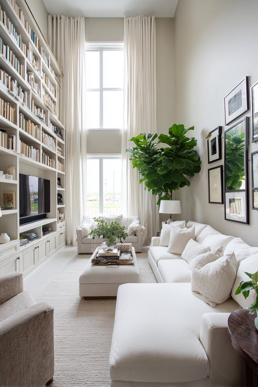 Tall bookshelves, floor-to-ceiling curtains, and wall-mounted shelving all draw the eye upward. This simple trick elongates the room visually and adds storage without consuming floor space. Even hanging artwork higher than usual encourages the gaze to travel up, creating the perception of height.