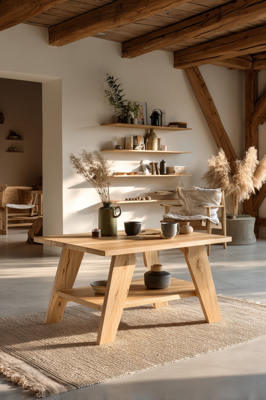 - Introduce a solid wood coffee table as a central textural anchor