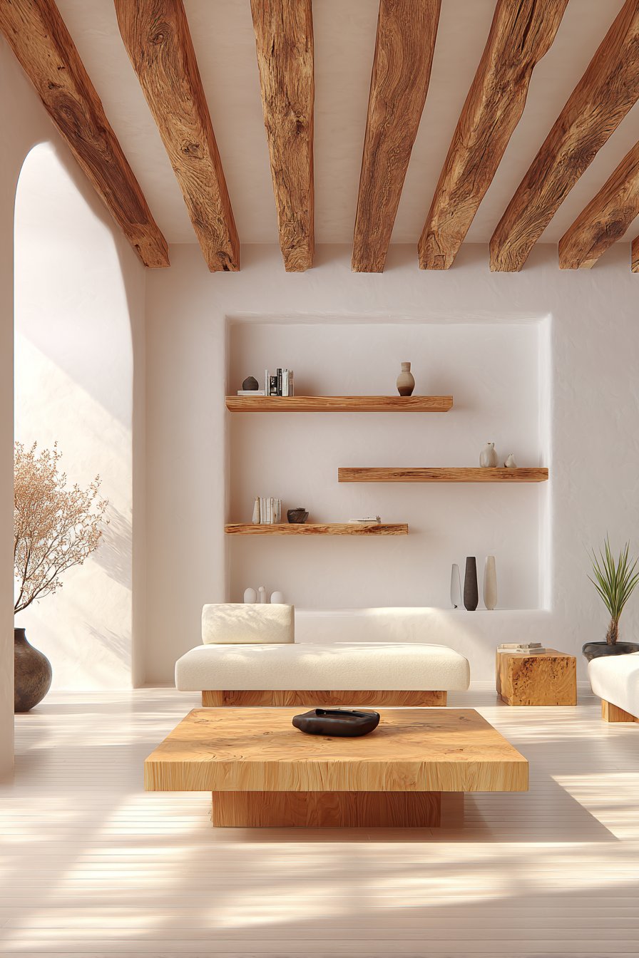 In minimal interiors, wood often serves as the primary warm element. A solid oak coffee table, a walnut side console, or exposed wooden ceiling beams can do enormous work in balancing the coolness of plaster walls and metal accents. The grain lines draw the eye gently and create movement without chaos.
