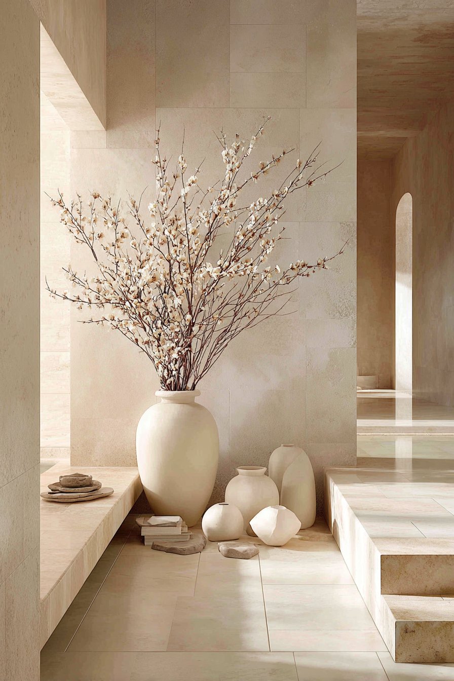 - Place a large matte ceramic vase as a focal point on a shelf or console