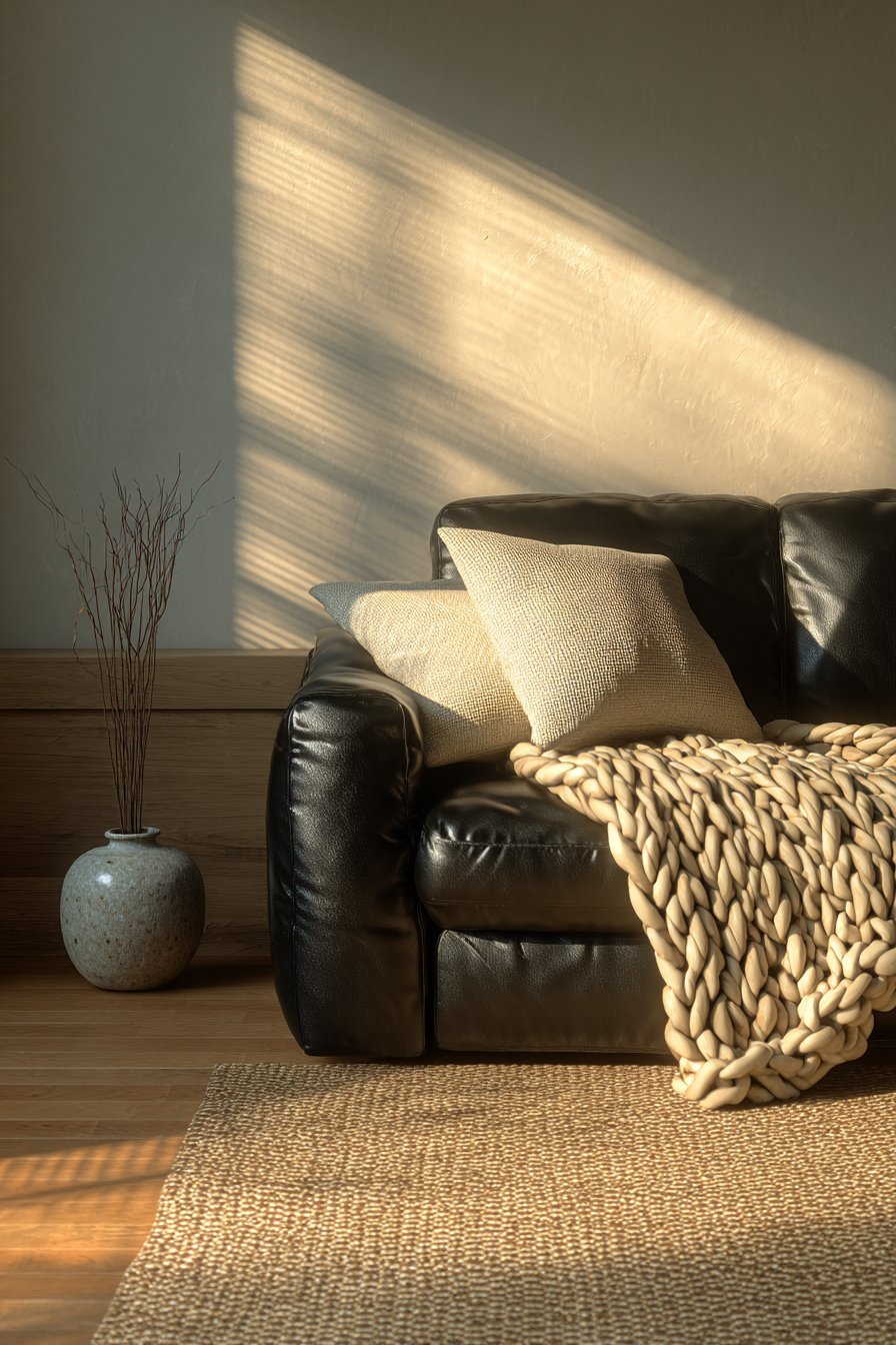 A smooth leather sofa paired with a chunky knit throw is a classic contrast pairing. The stark difference between the two surfaces makes both more interesting. Similarly, a polished marble surface next to a raw linen cushion creates a juxtaposition that feels sophisticated and intentional rather than accidental.