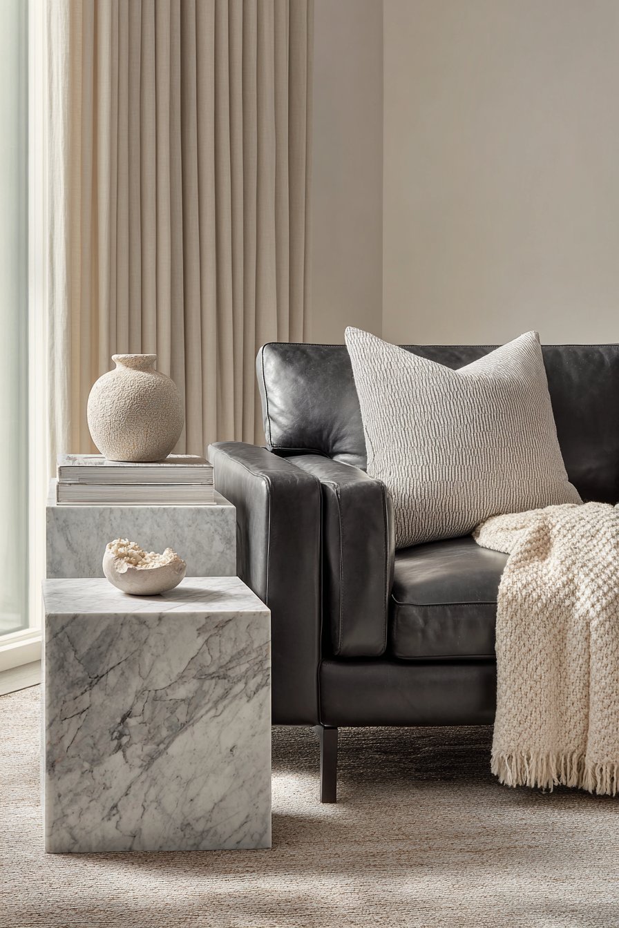 - Consider a marble or travertine coffee table for subtle luxury