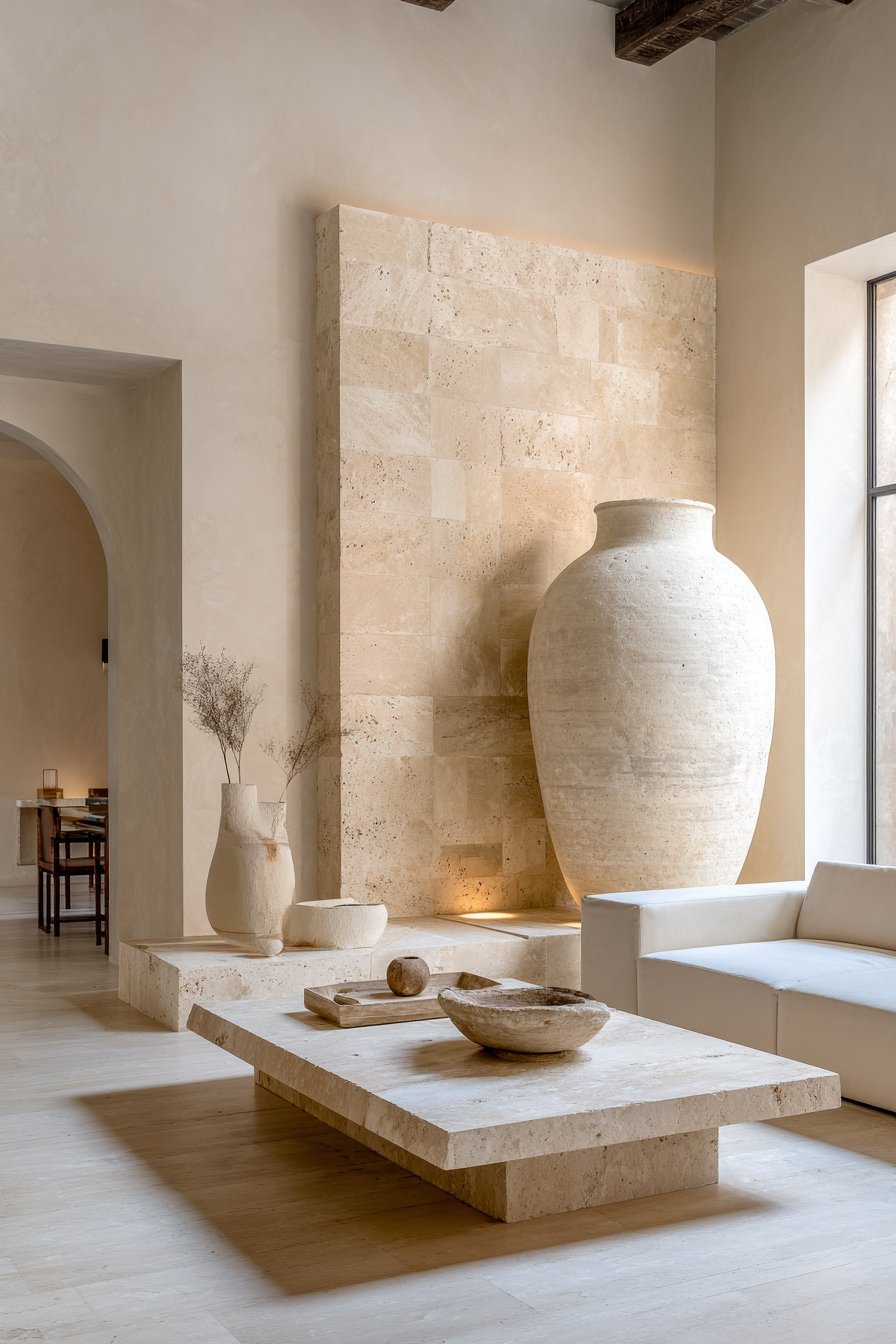 Stone and ceramic are among the most underrated texture providers in minimal living rooms. Their natural variation in color, surface, and finish brings a quiet luxury that feels both ancient and contemporary at the same time.