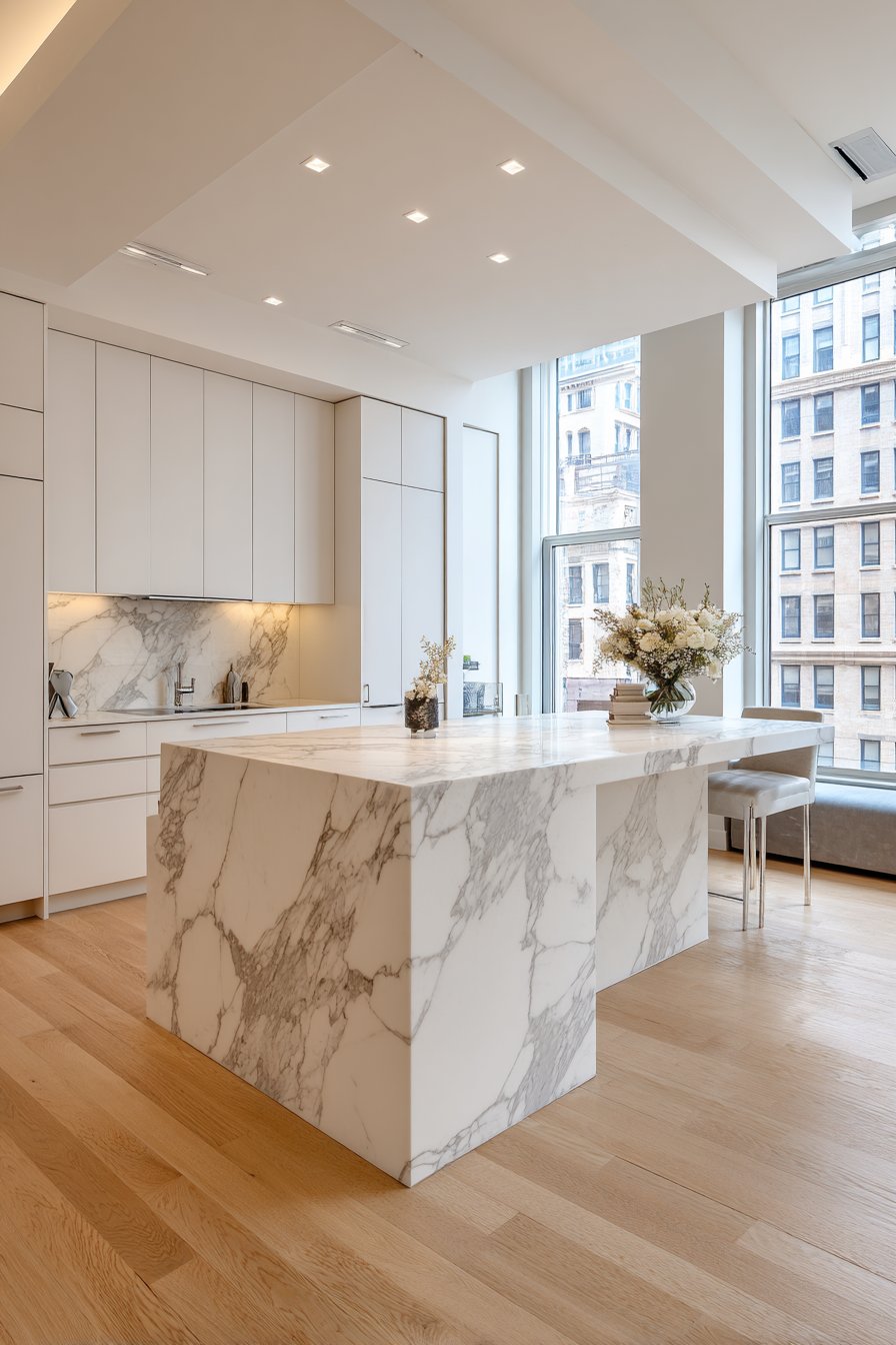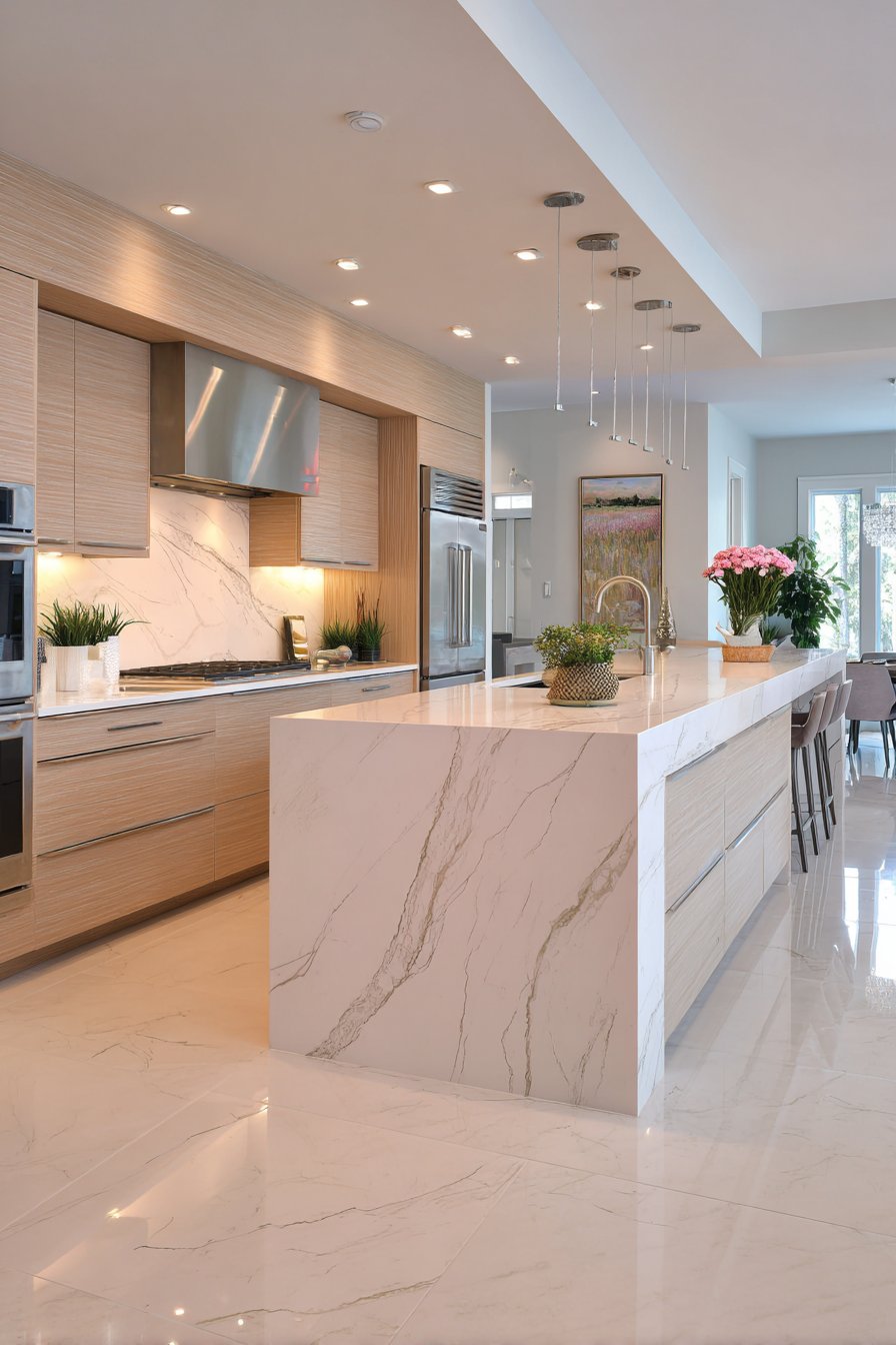 - Use waterfall countertops that eliminate the exposed cabinet edge