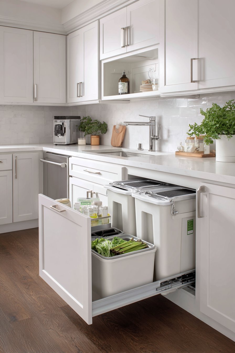 Visible trash and recycling bins create immediate clutter that undermines even the most carefully organized open kitchens. Installing pull-out waste systems within cabinetry removes this eyesore while maintaining convenient access. Hidden bins preserve aesthetic cleanliness and often provide better capacity than freestanding options. Position these systems near primary food preparation areas to encourage immediate disposal of packaging and waste during cooking processes.