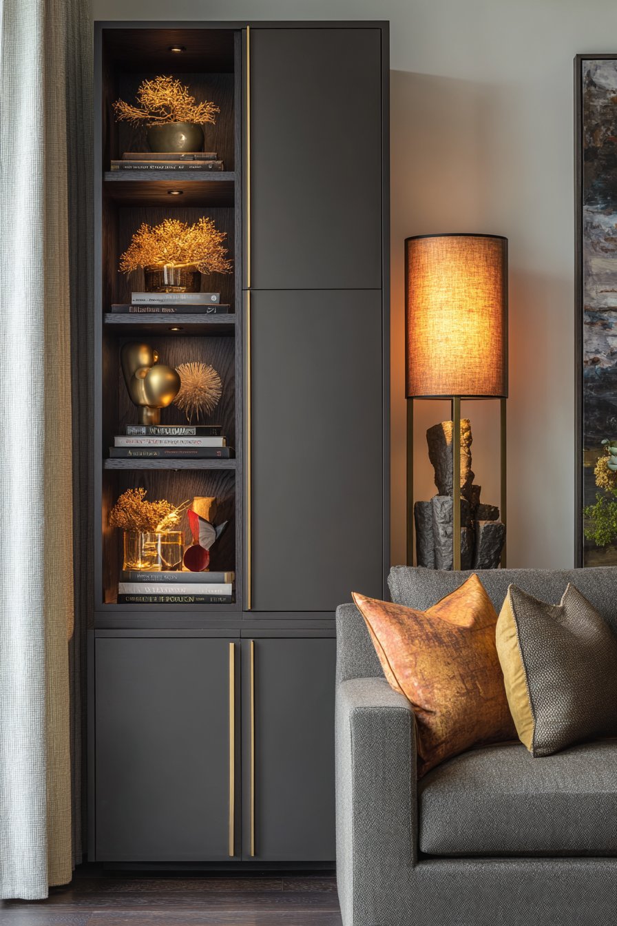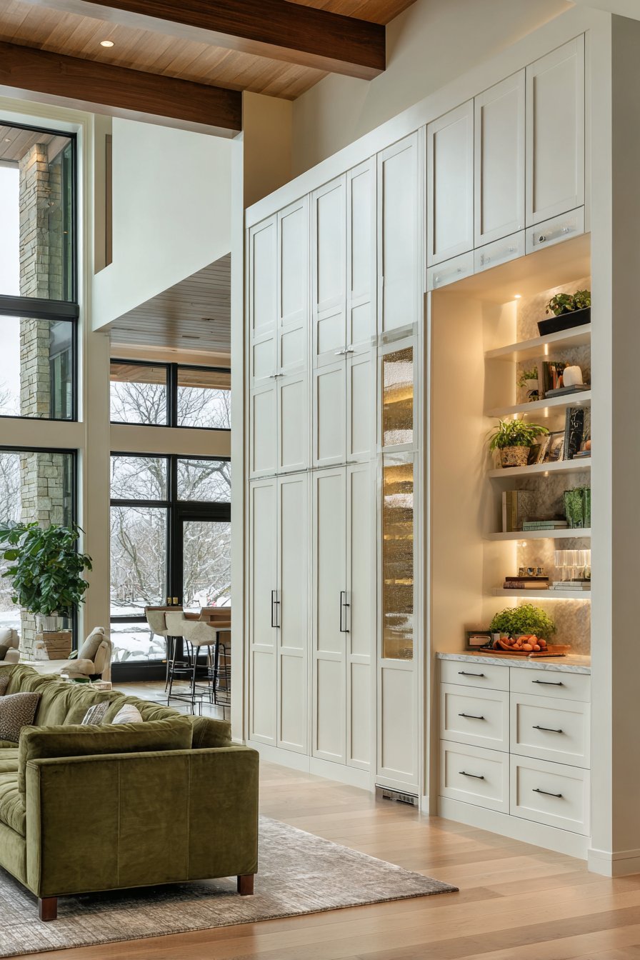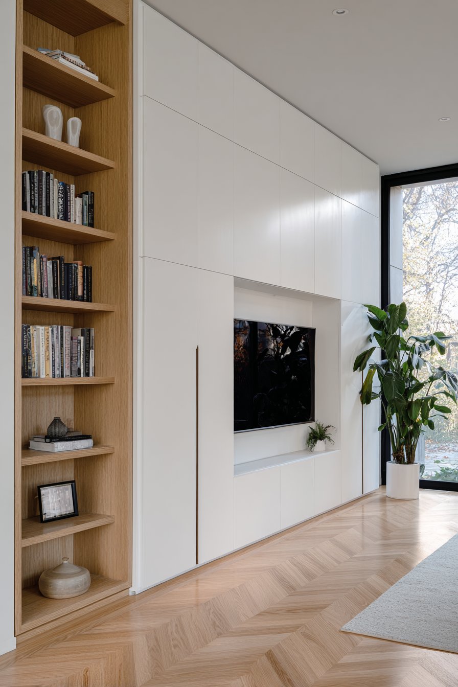 A sophisticated approach is layering both solutions. Use lower cabinets for hidden storage and upper open shelves for display. This combination is functional, visually balanced, and gives you the best of both worlds. Many of today’s most beautifully designed living rooms use exactly this hybrid storage strategy.