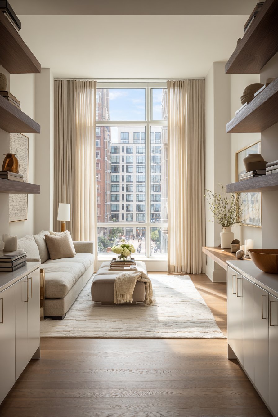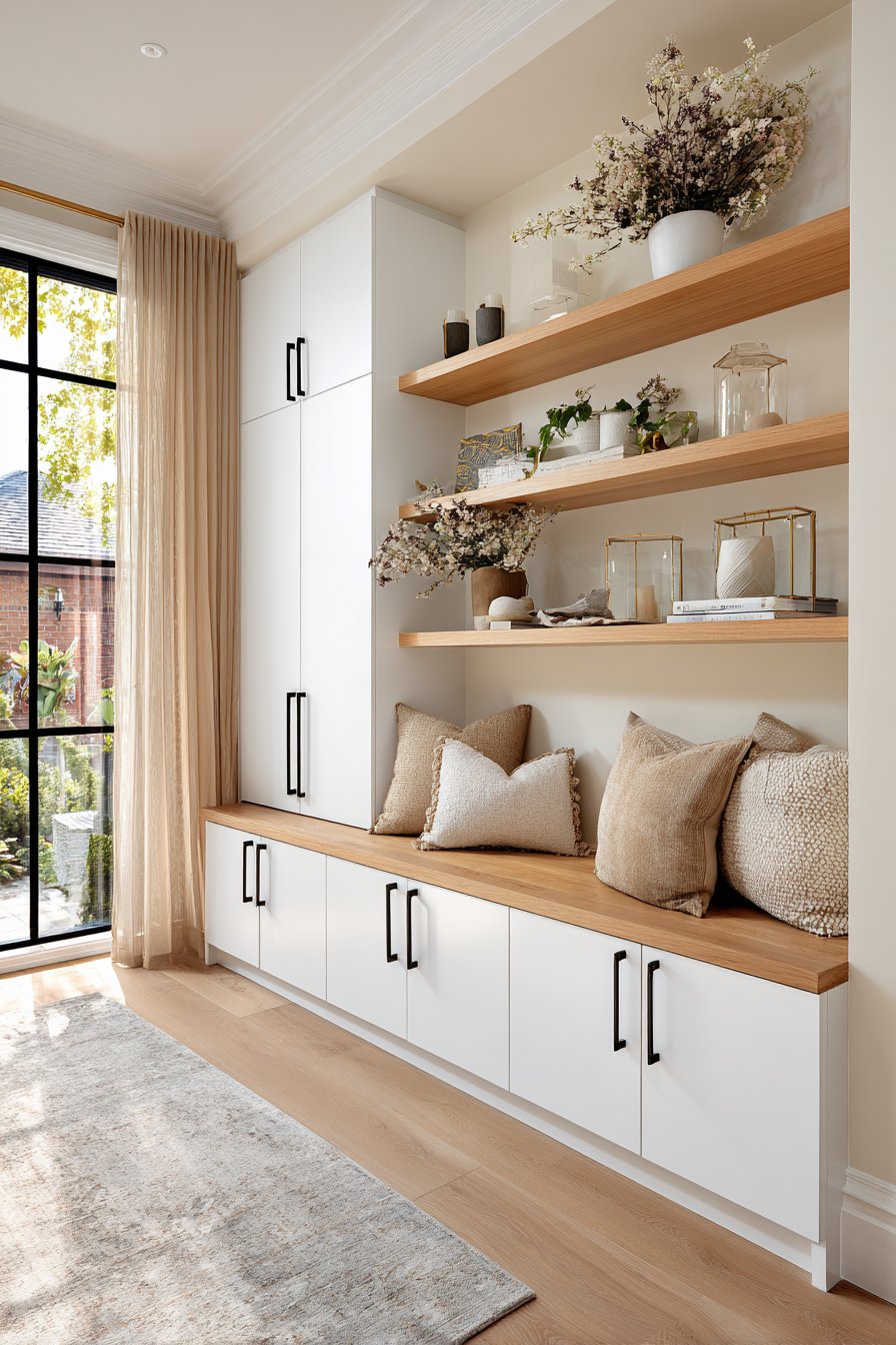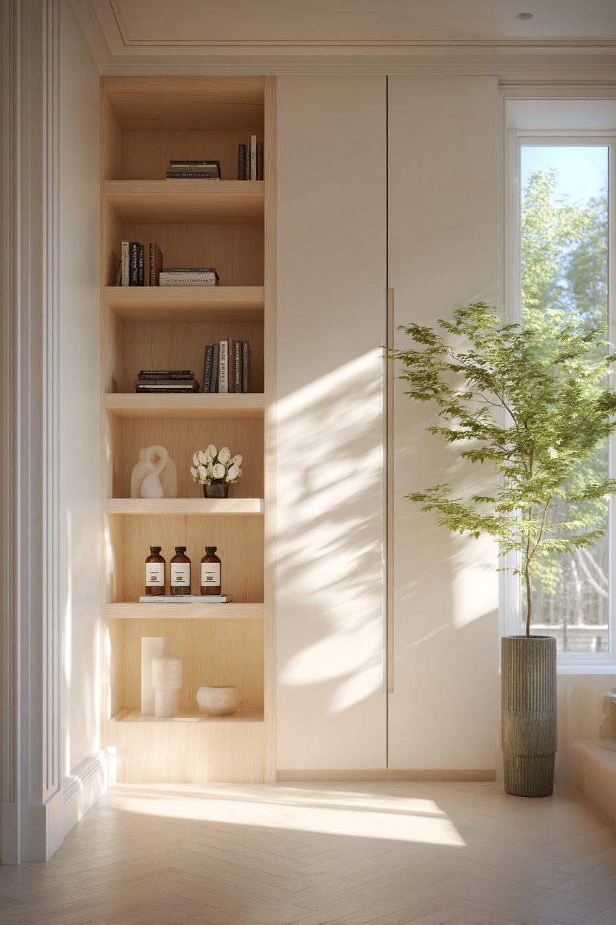 Built-in cabinetry in particular offers a streamlined, architectural look that elevates the entire room. Floor-to-ceiling cabinet units make walls feel purposeful and clean. They also provide significantly more storage capacity than open shelves of equivalent size, since depth can be maximized without any visual penalty.