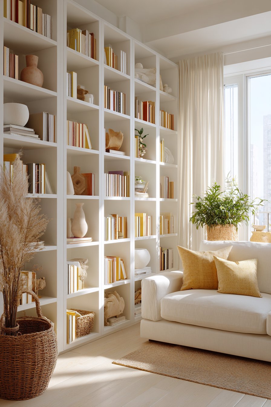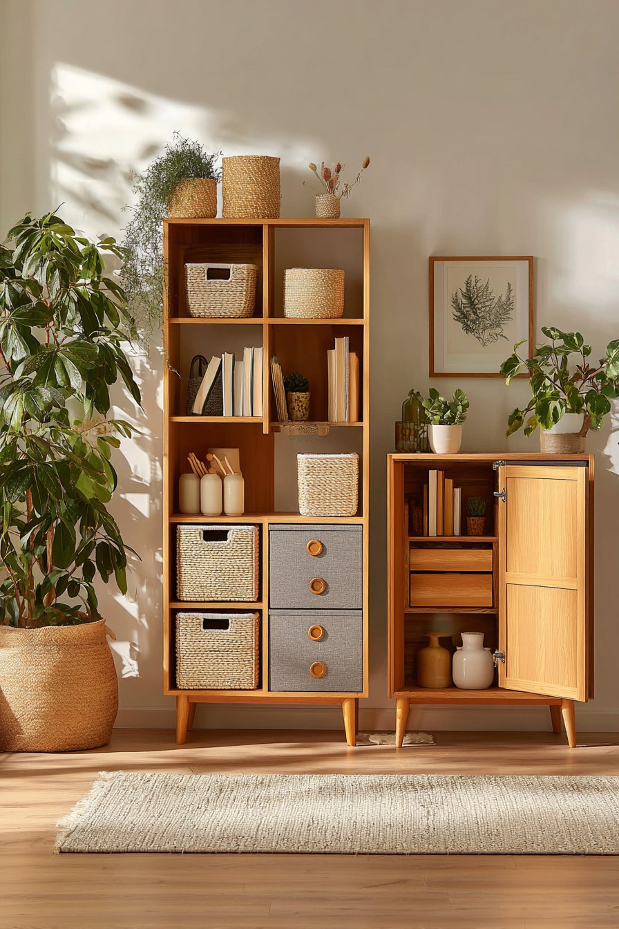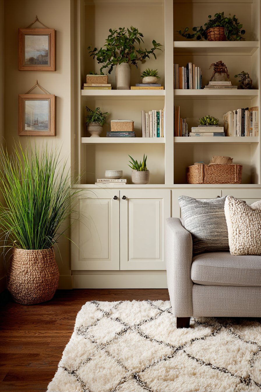The internal organization of your storage dramatically affects how tidy your living room feels and functions. Open shelf organization relies entirely on visible systems. Matching baskets, labeled containers, and thoughtful groupings are essential. Without these, open shelves become a visual dumping ground.