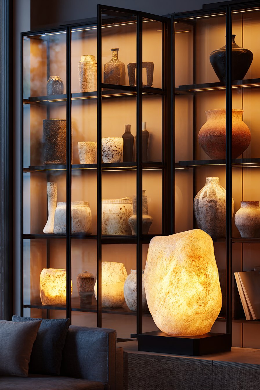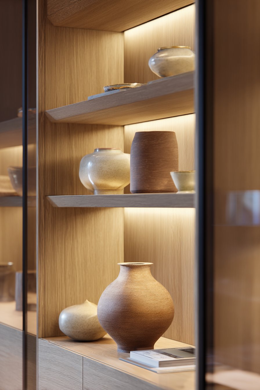 - Treat lower cabinet surfaces as display space for larger sculptural objects