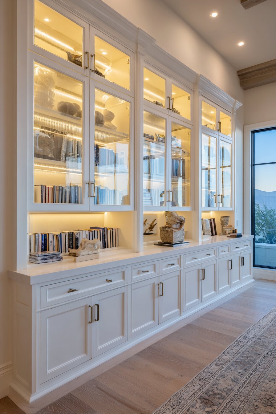 Glass cabinet doors work beautifully when contents are deliberately curated. Displaying a collection of books with matching spines, fine ceramics, or carefully arranged barware behind glass creates a sophisticated, intentional look. Unlike fully open shelves, glass doors signal that the display is purposeful and protected.