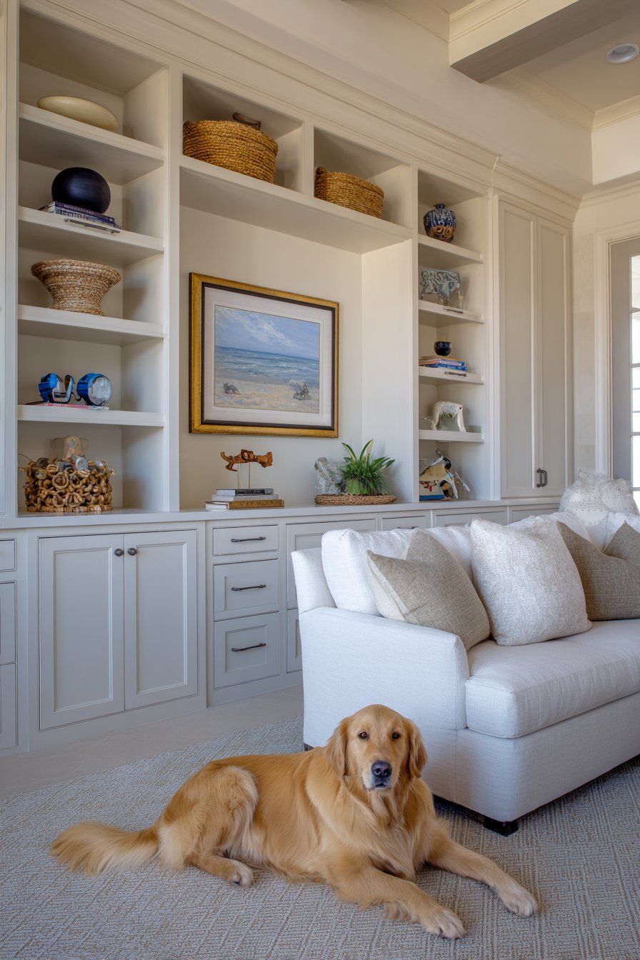 - Store pet accessories in closed cabinets to maintain a clean living room look