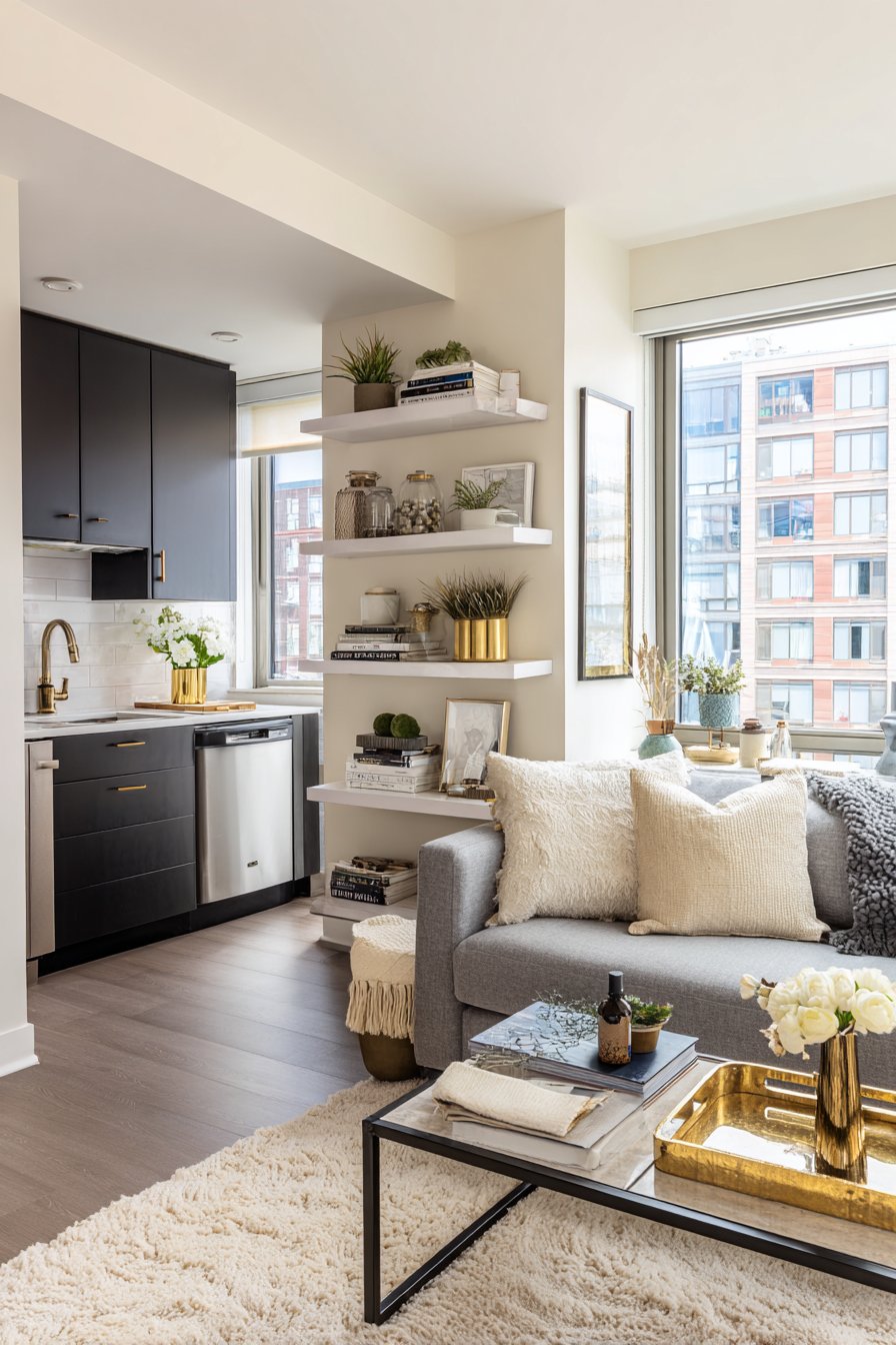 - Use mirrors alongside open shelves to amplify light and depth perception