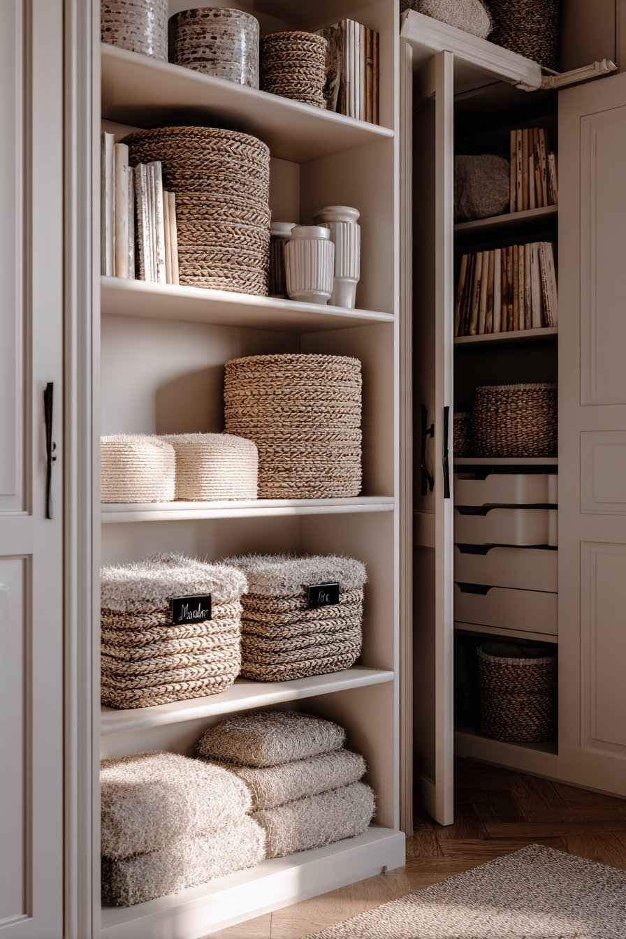 - Use consistent basket or box materials on open shelves for a cohesive look