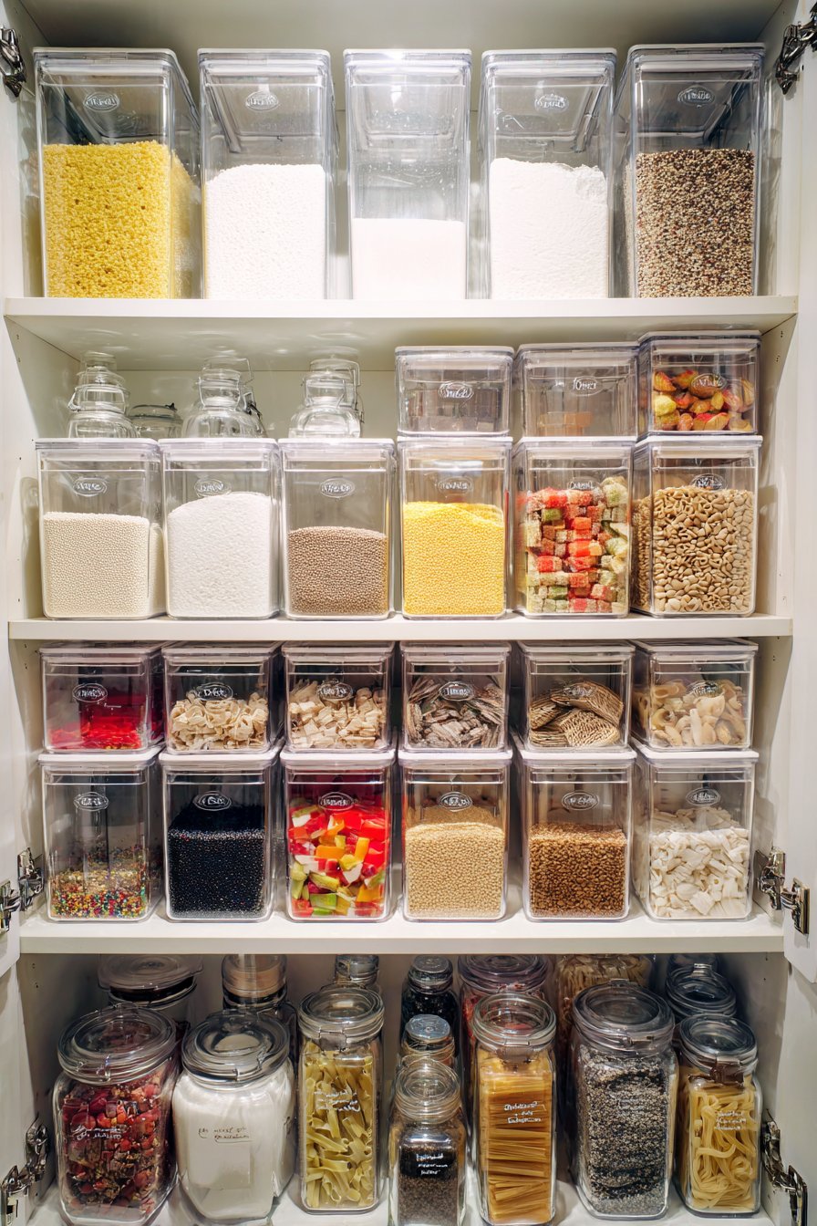 Transferring dry goods from original packaging into standardized containers creates visual cohesion while improving space efficiency and ingredient freshness. Matching containers stack neatly, eliminating wasted space between oddly-shaped boxes and bags. This system also provides airtight storage that extends shelf life for flour, sugar, rice, pasta, and other pantry staples by protecting them from moisture and pests.