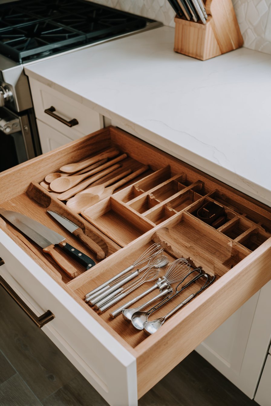 Kitchen drawers without dividers become chaotic jumbles where locating specific utensils wastes valuable cooking time. Custom drawer organization systems create designated spaces for every tool, ensuring you can grab what you need in seconds rather than sorting through tangled implements. This systematic approach applies to both utensil drawers and cooking tool drawers near your primary prep and cooking zones.