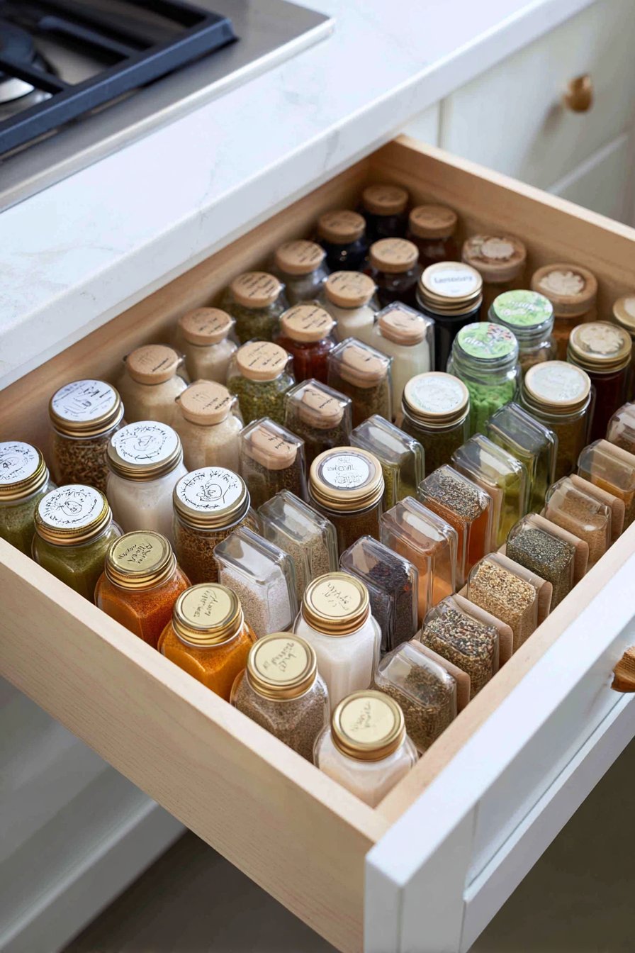 - Label jar tops and fronts for visibility in both drawer and shelf storage