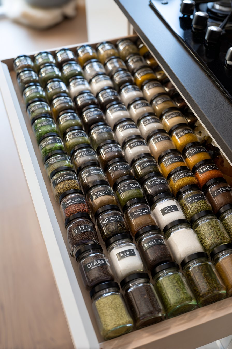 Alphabetical organization creates the most universally accessible system that works for all household members and guests. Transfer spices into matching jars with clear labels, positioning them in a drawer with labels facing up or on tiered cabinet shelves with labels facing forward. For drawer storage, consider expandable spice drawer inserts that angle jars for complete visibility. Cabinet-based systems benefit from three-tiered step shelves that prevent small jars from hiding behind larger containers.