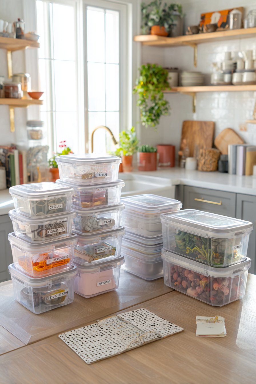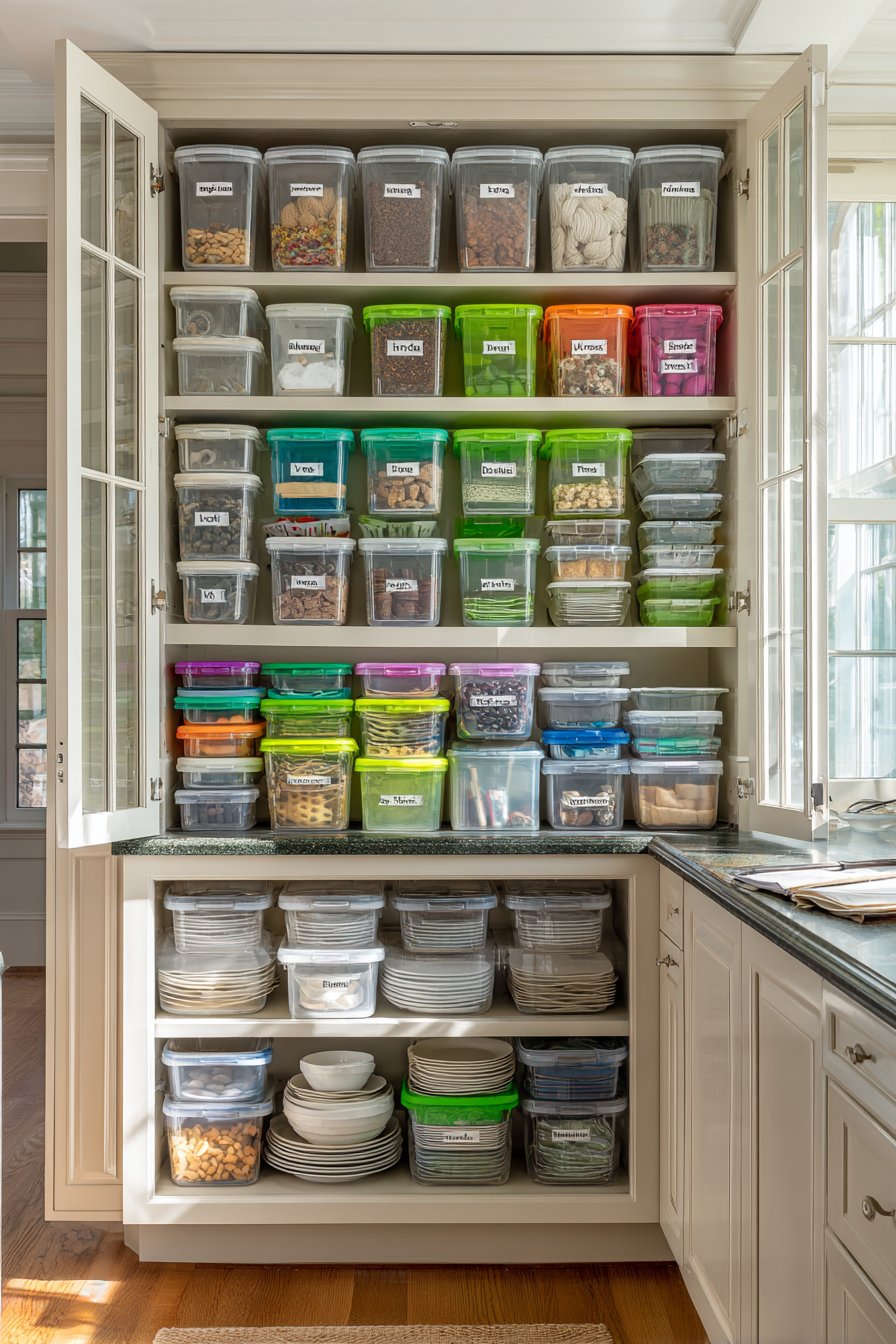 - Stack same-size containers vertically to maximize vertical cabinet space