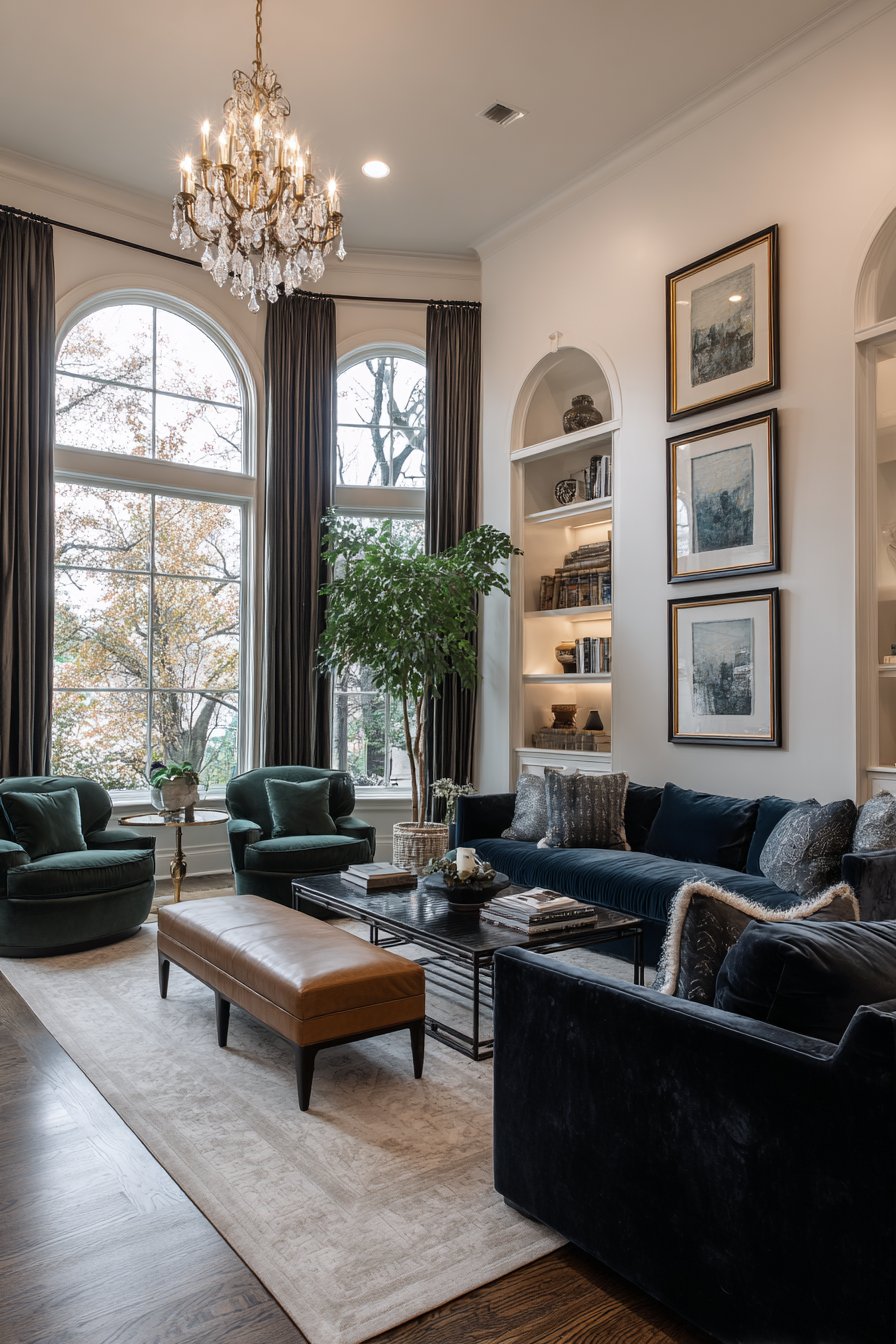 In rich living rooms, black appears in intentional moments—window frames, light fixtures, furniture legs, or decorative accessories. These touches create contrast that makes other colors appear more vibrant and intentional. Black also provides visual weight that balances lighter elements and creates rhythm throughout the space.