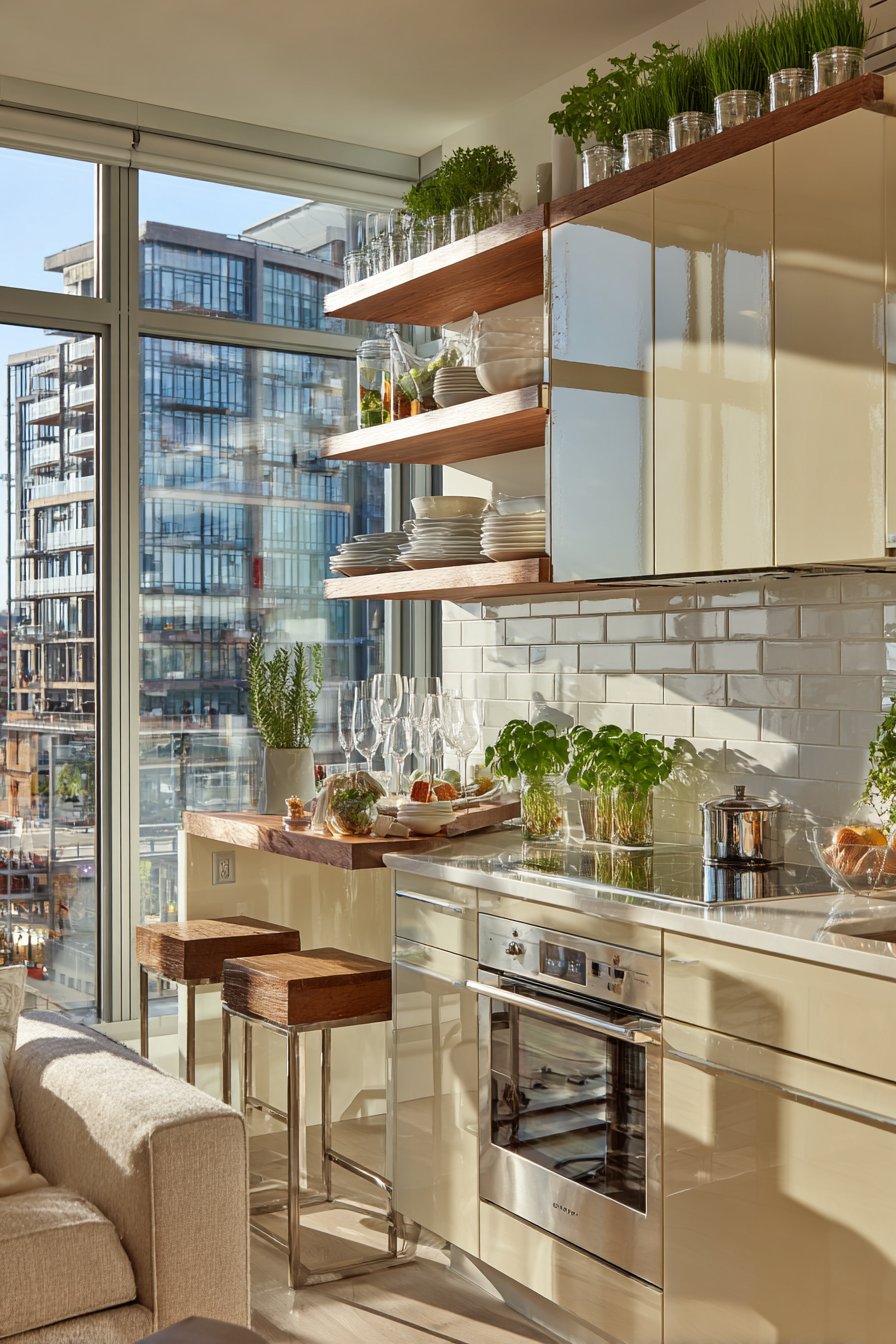 Looking upward reveals untapped storage potential in every small kitchen. Wall-mounted shelves, ceiling-height cabinets, and hanging racks utilize space that typically goes unused. This vertical approach multiplies your storage capacity without consuming precious floor area or counter space.