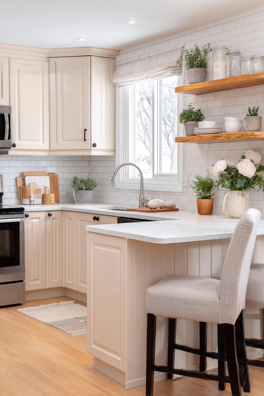Light color palettes make small kitchens feel significantly larger and more open. White, cream, and soft gray cabinets reflect natural light throughout the space. These neutral backgrounds create airy atmospheres that counteract the potential claustrophobia of tight quarters.