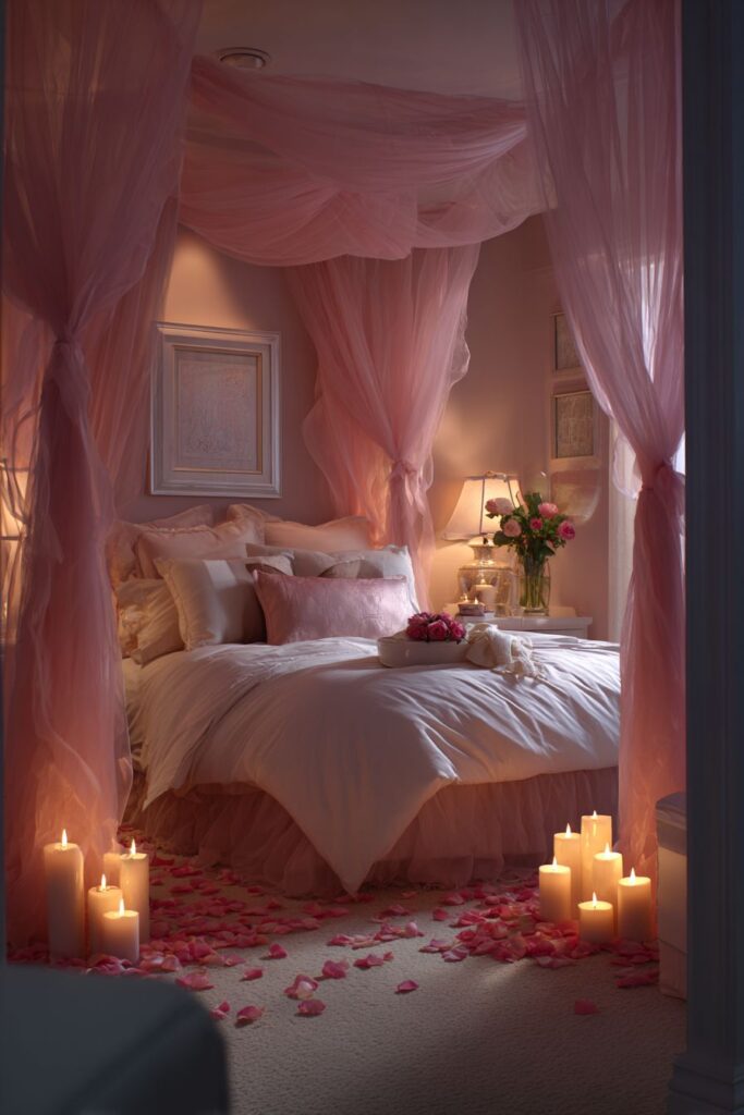Step into a bedroom transformed by the ethereal beauty of soft pink silk curtains that cascade gracefully around the bed frame, creating an intimate cocoon of luxury and warmth. The gentle fabric catches and diffuses light beautifully, while scattered rose petals across crisp white bedding add organic texture and natural fragrance that immediately signals romance. This transformation elevates the ordinary bedroom into a five-star hotel suite experience, where every detail has been considered for maximum romantic impact.