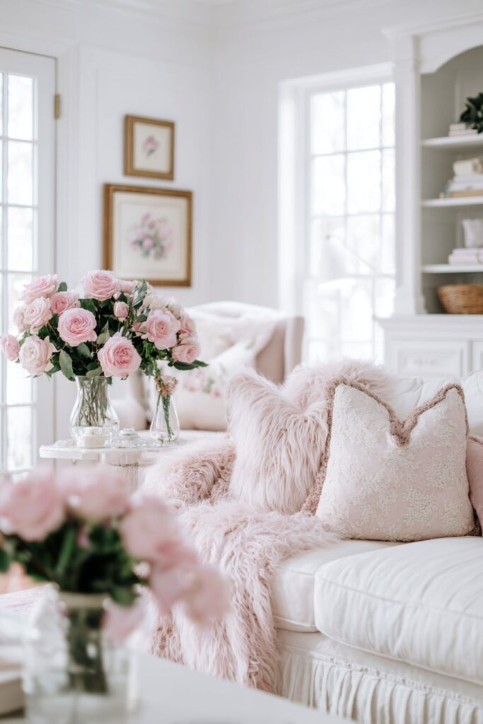 Complete your romantic room transformation by temporarily filling existing picture frames with handwritten love notes and romantic poetry, arranged thoughtfully on side tables alongside single-stem red roses in small bud vases, while the existing sofa gains luxury appeal through the addition of a sumptuous faux fur throw in blush pink that provides textural contrast and visual warmth.